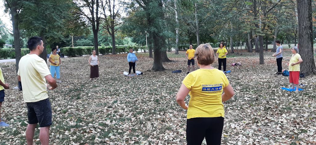 图11~12:在八月十一日至十六日,学员们到海边传播法轮功真相活动之际,每天早上,学员们都在康斯坦察州Tăbăcărie公园的炼功点炼功。