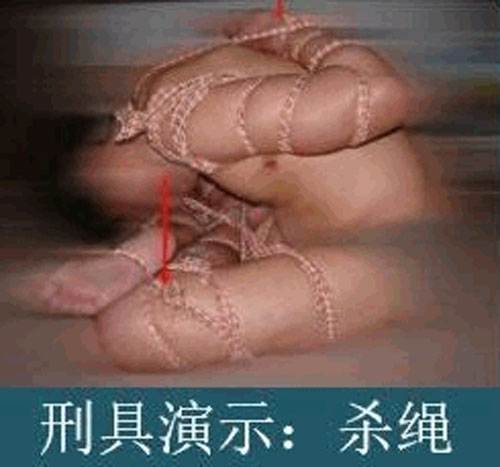 图6:王云洁被狱警用两根高压电棒同时电击乳房数小时,致使整个乳房完全溃烂。回家后,她乳房溃烂,于二零零六年七月含冤去世。图7:刑具演示:杀绳