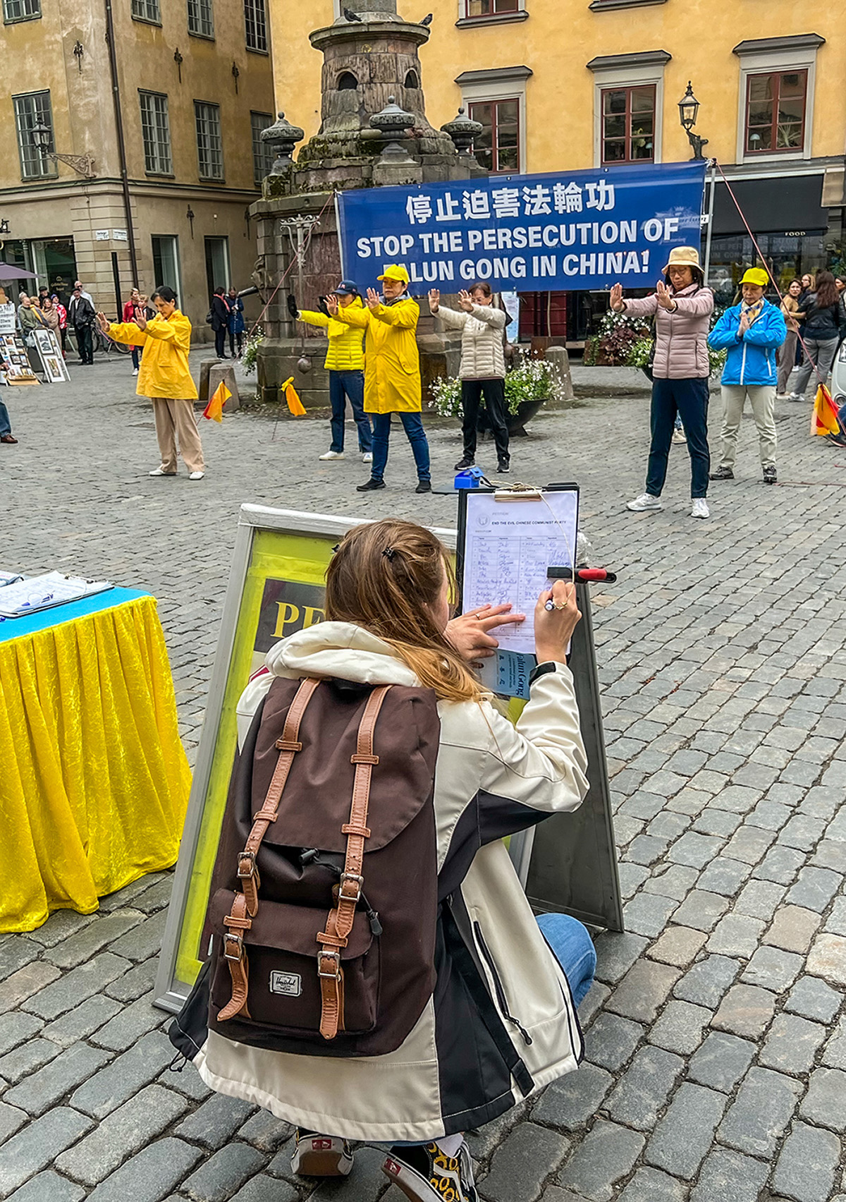 安是一位中年亚裔女士,九月十六日周五这天,她和她的瑞典先生经过活动场地时,主动上前和学员交谈并介绍自己是移民瑞典二十多年的香港人。