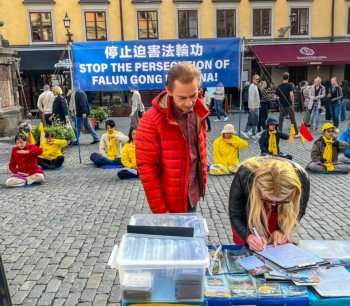 克里斯托弗(Christopher)是来自瑞典北部城市的一位教师,他介绍自己以前曾去过中国,三年前还去过香港,他对中国糟糕的人权状况有所了解。当他听到中共对法轮功学员如此残酷的迫害时,震惊又气愤。“(法轮功受迫害)这是一件很大、很重要的事情,我们知道的人要重视起来,大家共同来制止!”他不仅签了字,还说:“请给我一些英文资料,我要跟我的学生们去讲中共一直在迫害法轮功的事情(包括活摘器官)。”他表示必须要帮助法轮功学员传播真相,把(中共)这个独裁政府干的这些见不得人的事曝光,制止中共迫害好人。