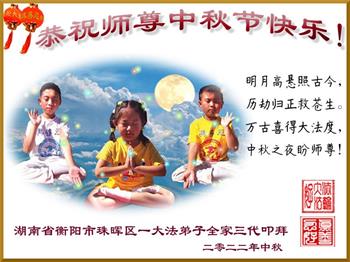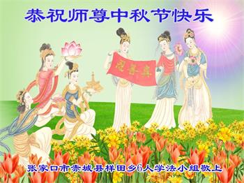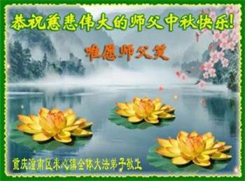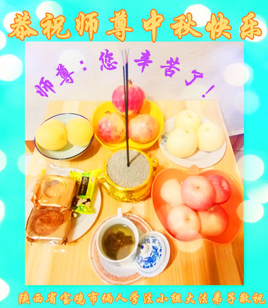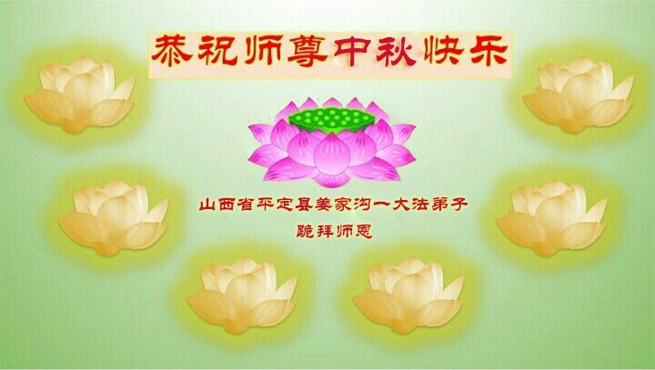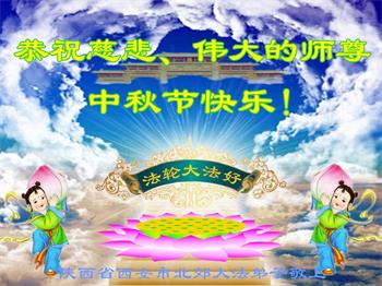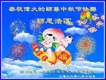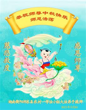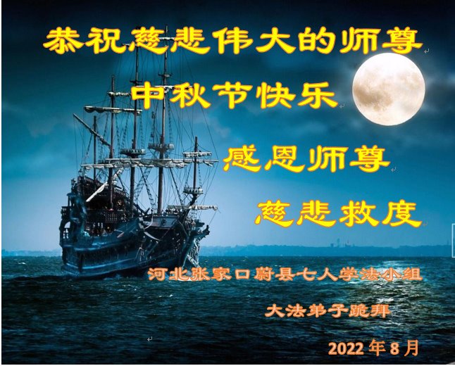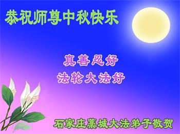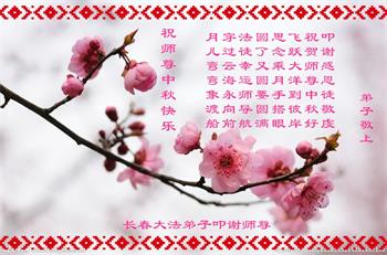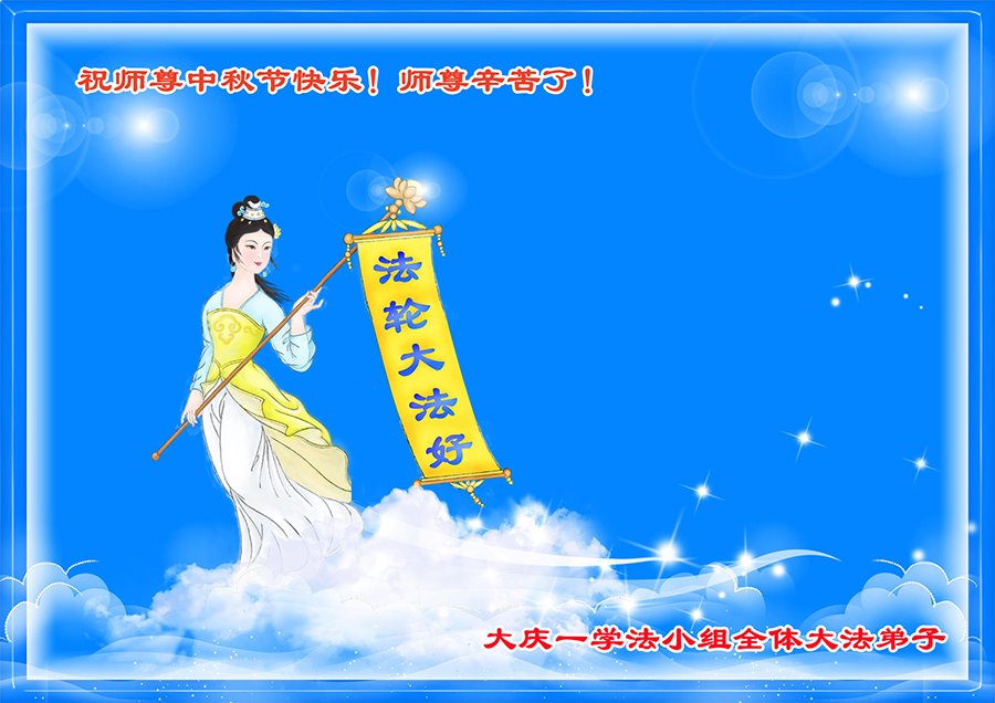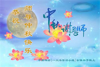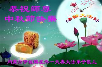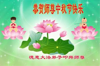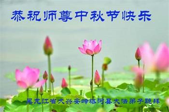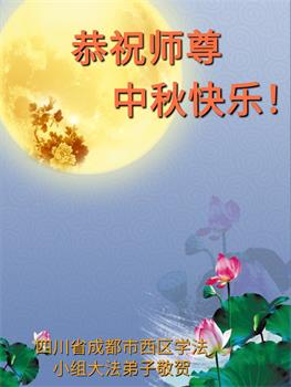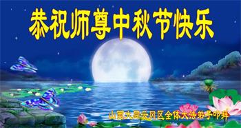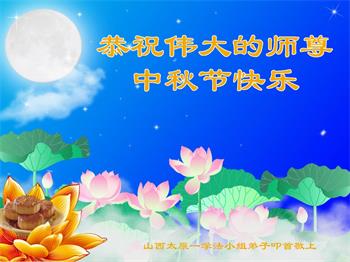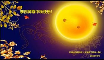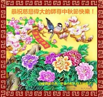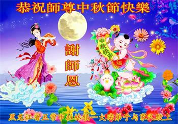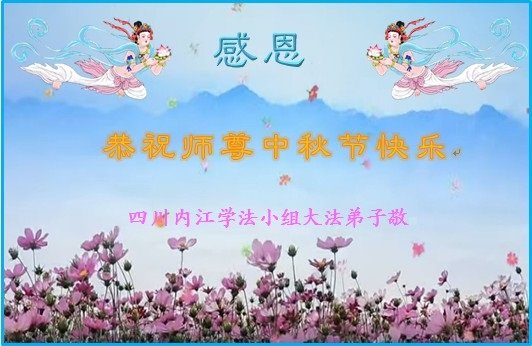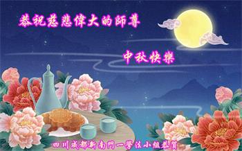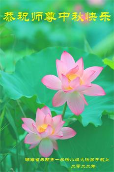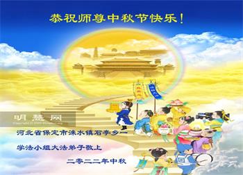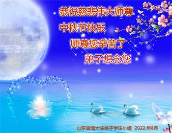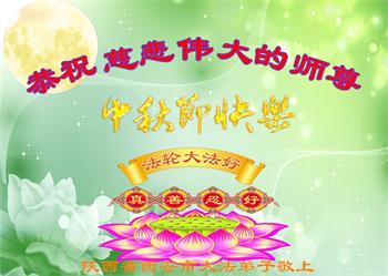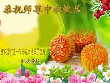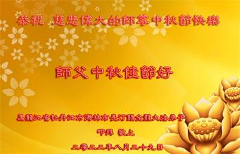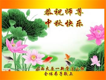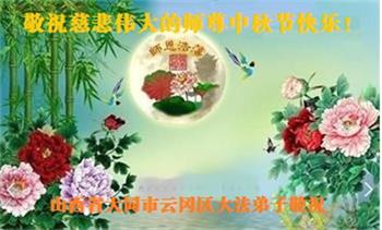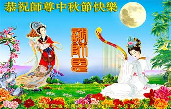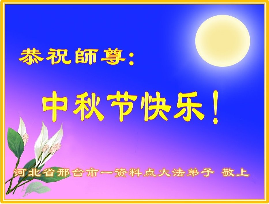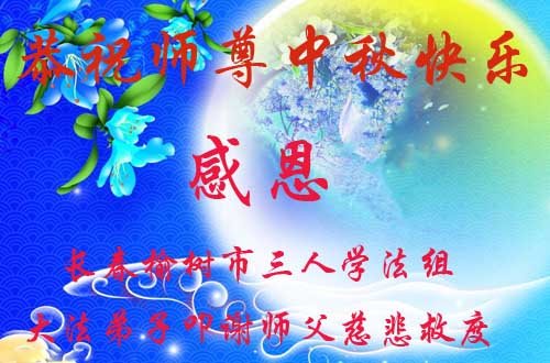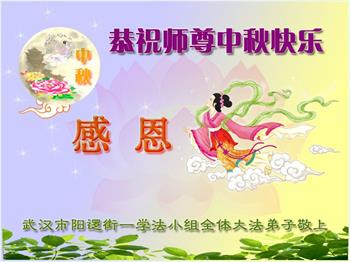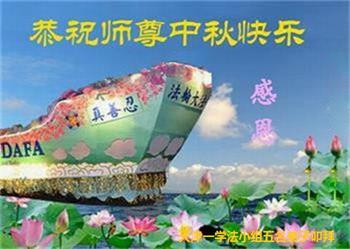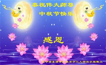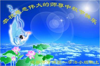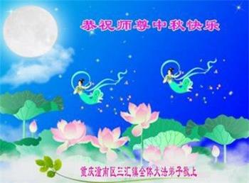 湖北省黄冈市一学法小组大法弟子在贺词中说:“月到中秋分外明,每逢佳节倍思亲。在这美好的时刻,我们十分想念师尊,伟大的师尊所承受的、付出的,弟子不知道用何语言来形容表达。在正法最后时刻,唯弟子勇猛精進,遵师言,做好三件事,快救人,多救人。”