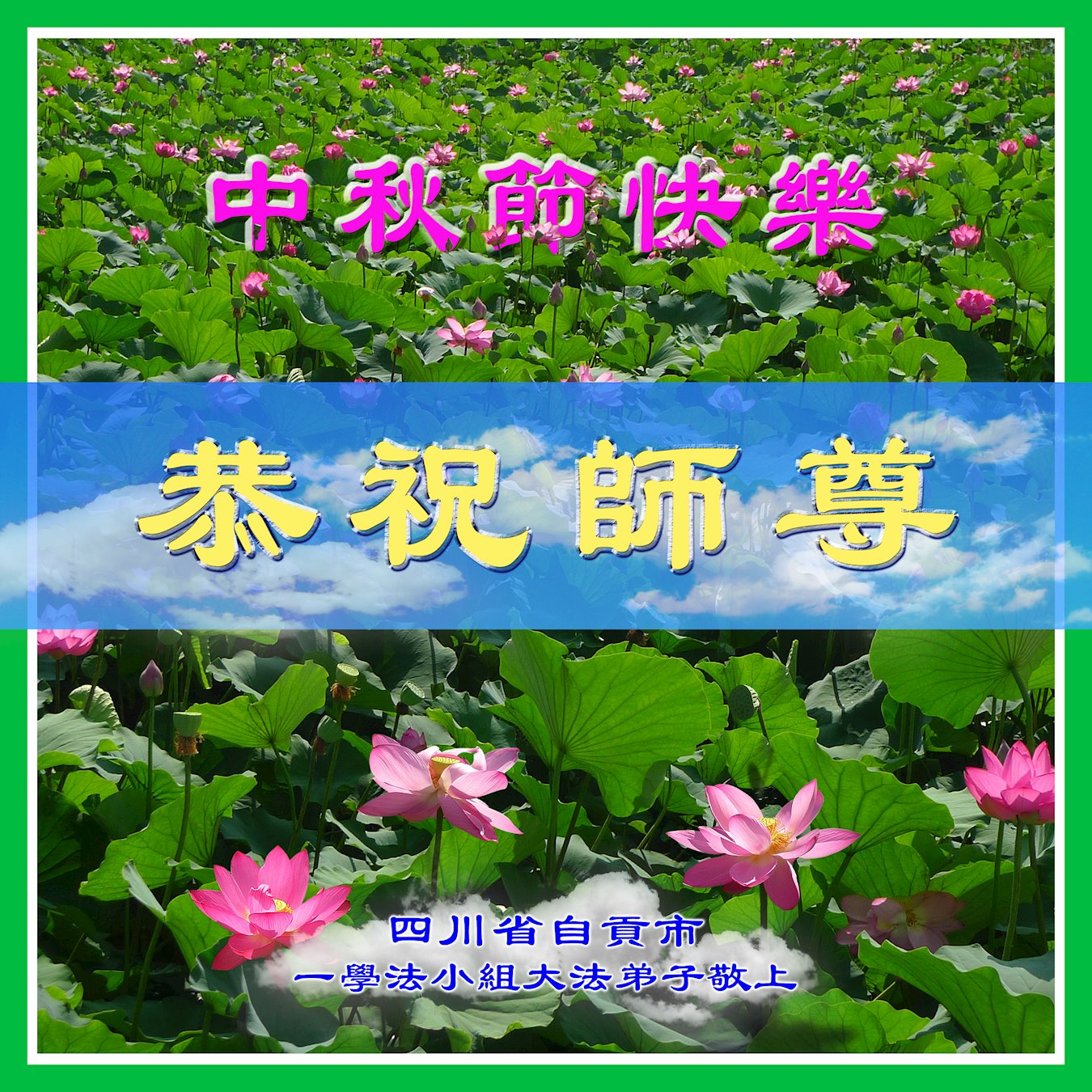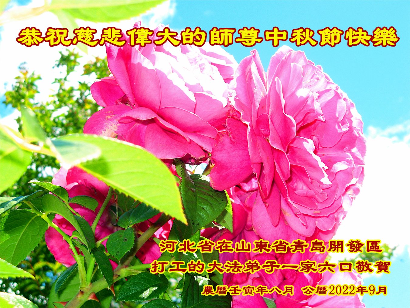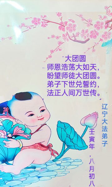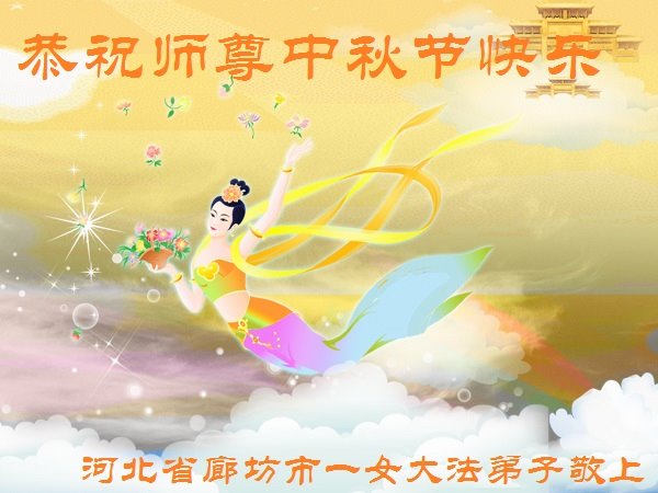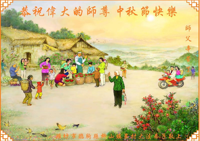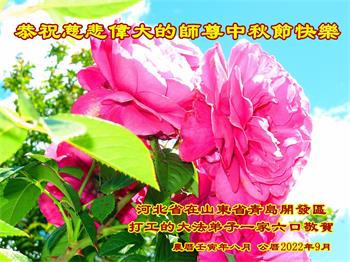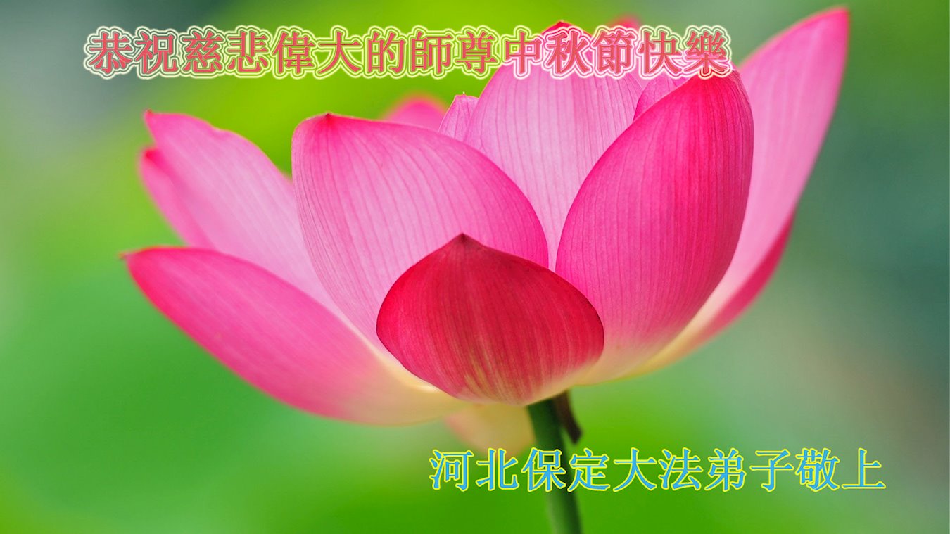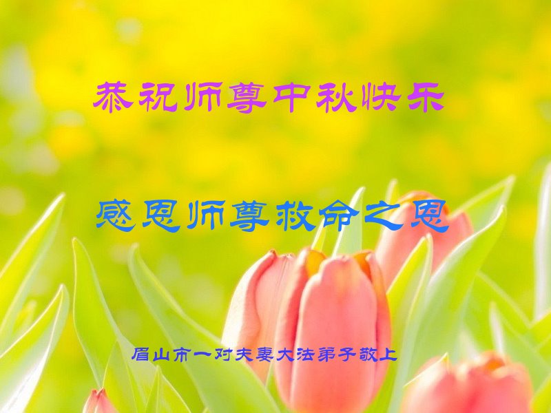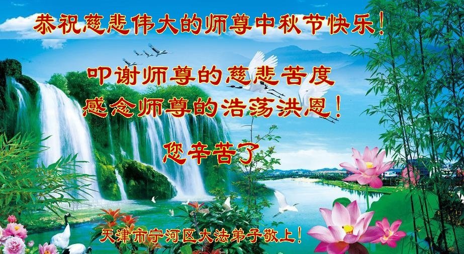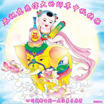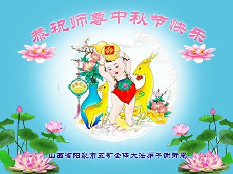 是师父的巨大承受才使我们又迎来了一个温馨的中秋。弟子们怀着感恩的心恭祝恩师中秋佳节快乐!历史走到今天的关键时刻,诚念“九字真言”而逢凶化吉、遇难呈祥的真实例子,证实了法轮大法在人间的神奇,破除了中共的欺世谎言。弟子每一个前進的步伐都浸透着师父的心血,我们一定更加努力,踏踏实实的修好自己,抓紧救度众生,完成史前大愿!