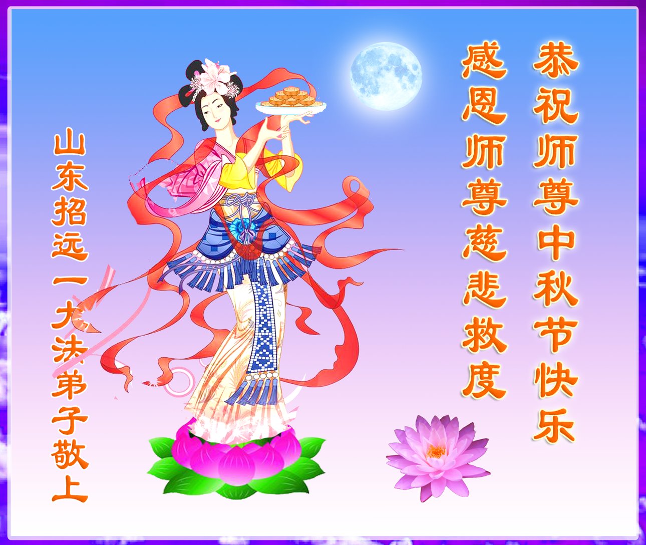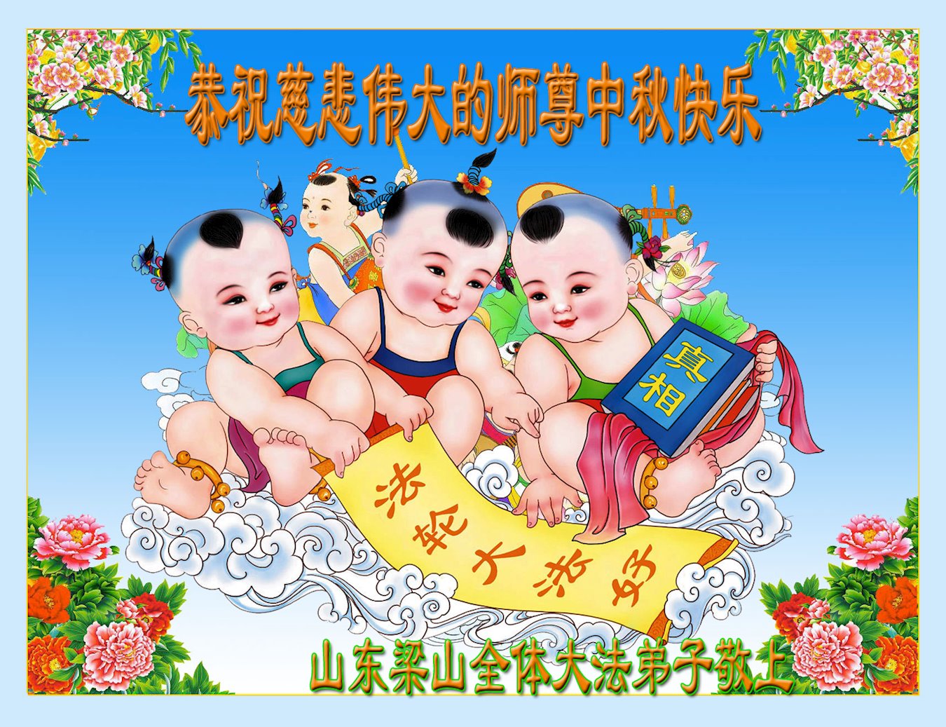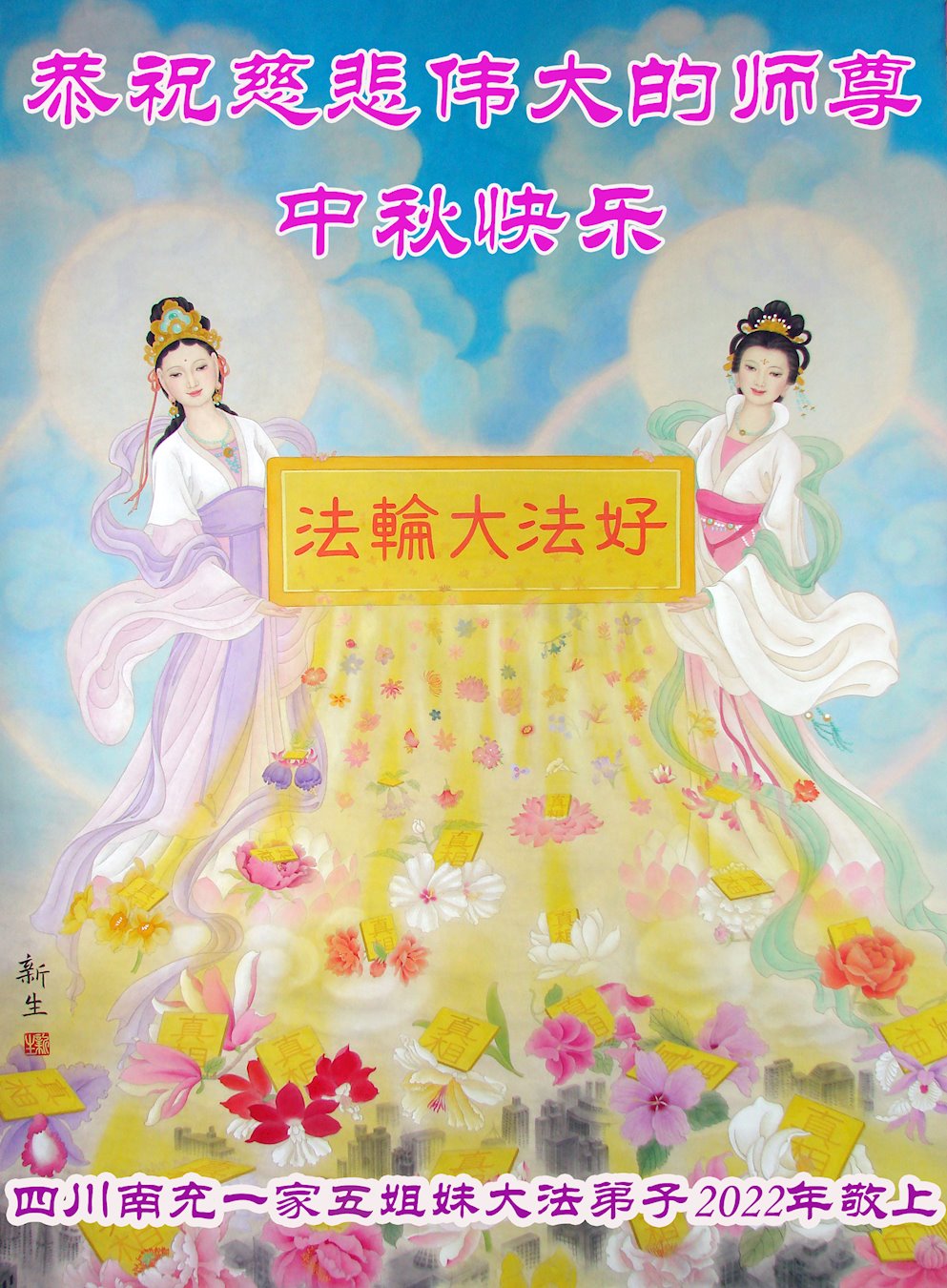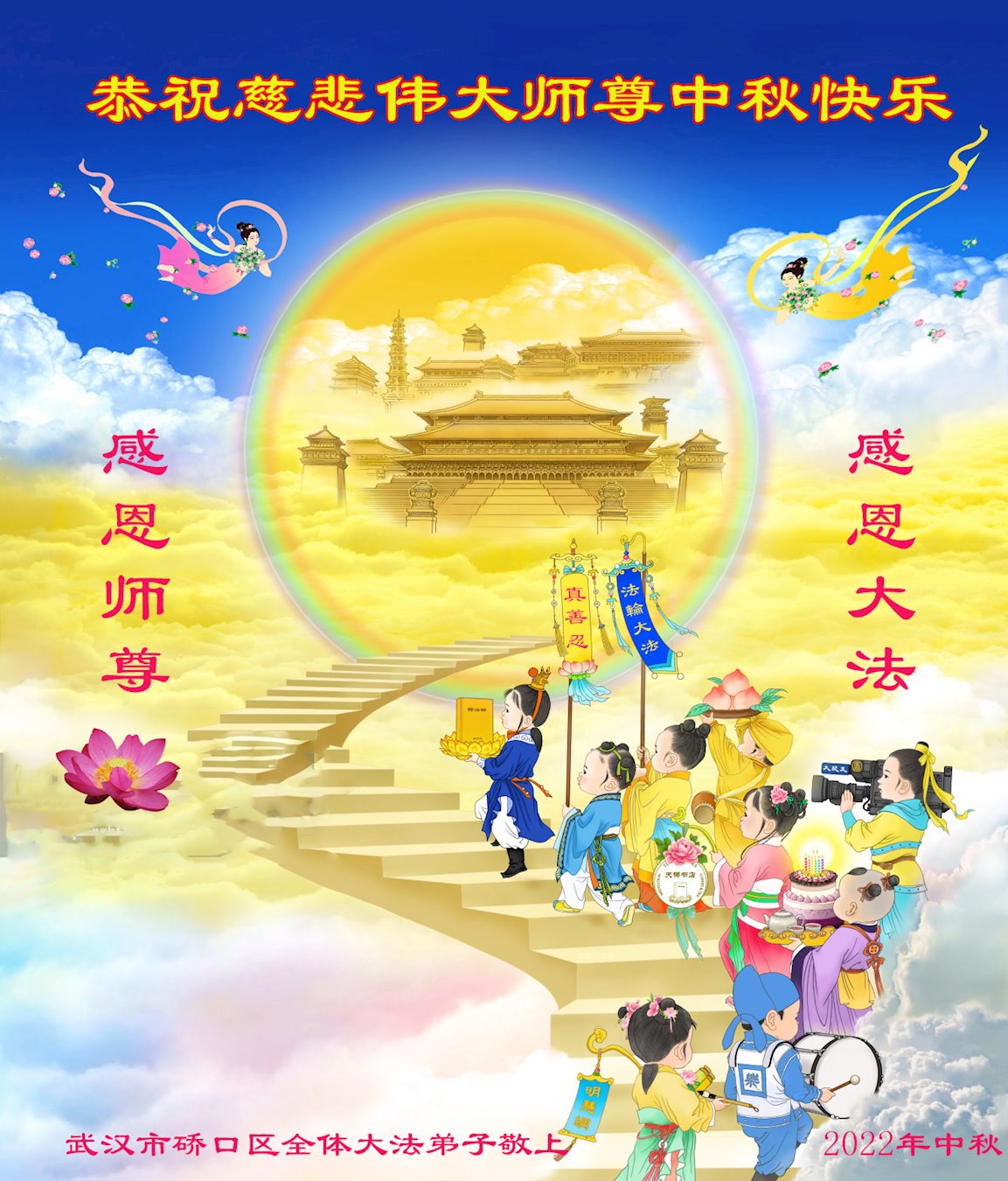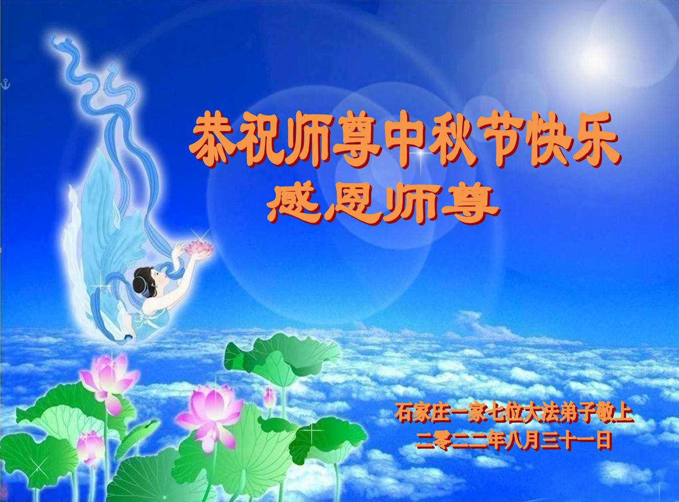 【明慧网二零二二年九月八日】法轮大法洪传世间,李洪志师尊慈悲的教诲和度化弟子,也慈悲的看护着世上每一个有缘人,把法轮大法的甘露洒向世界的每个角落,诚信“法轮大法好、真善忍好”的人们得到了大法给予的福祉。在二零二二年中秋节即将到来之际,明白法轮大法好的中国百姓向尊敬的李大师表达发自心底的感恩,恭祝大法师父中秋节快乐!
