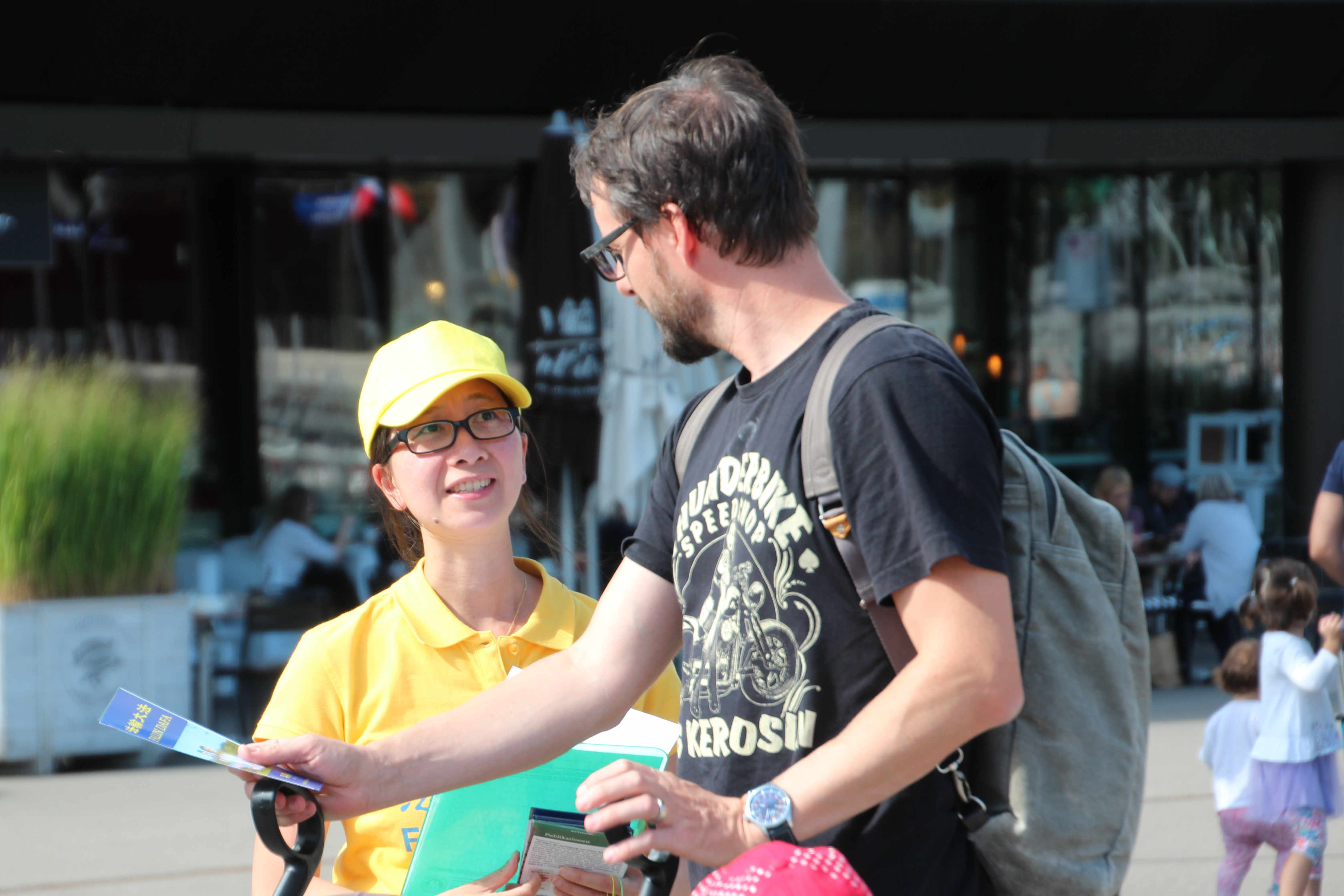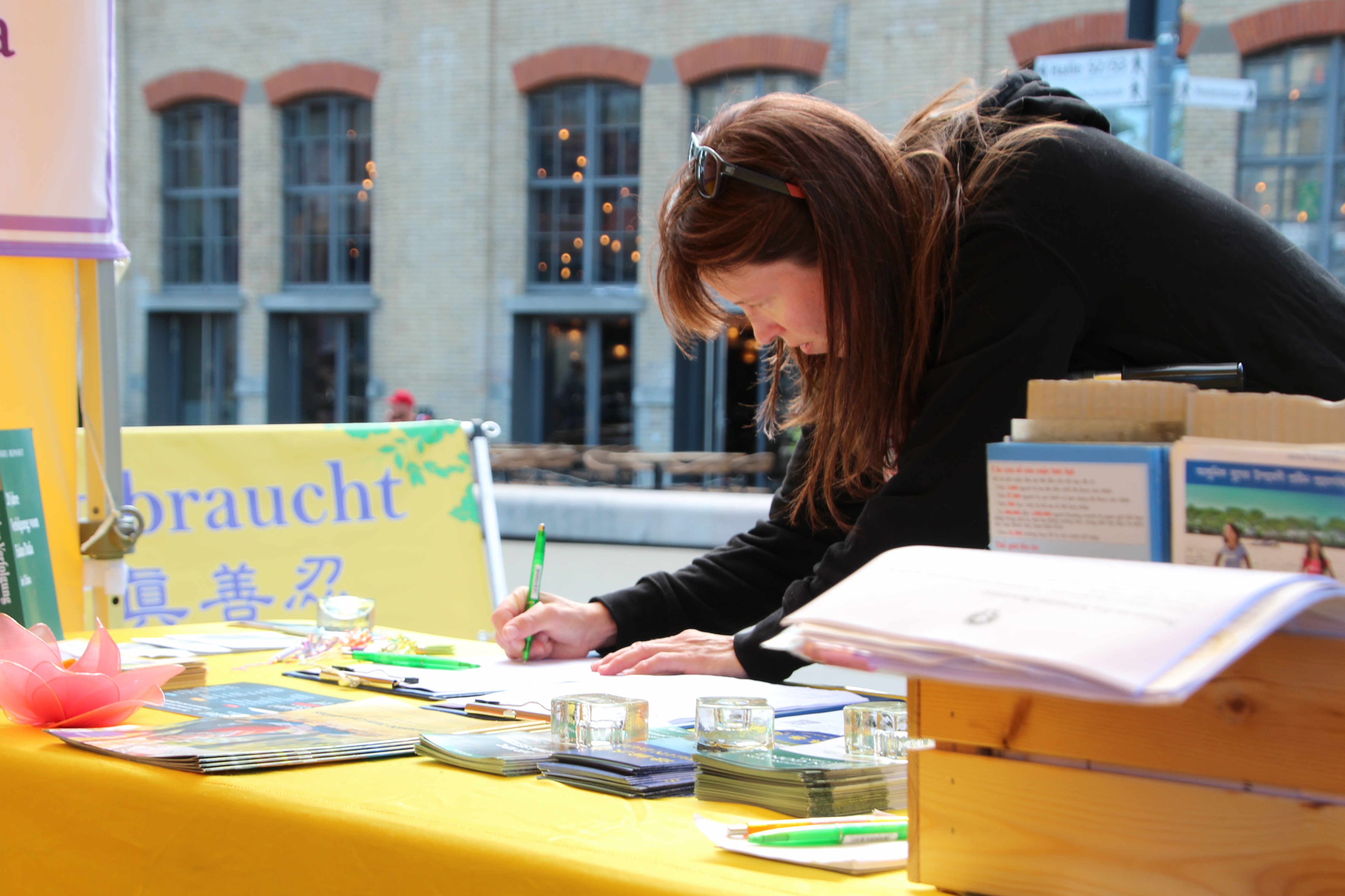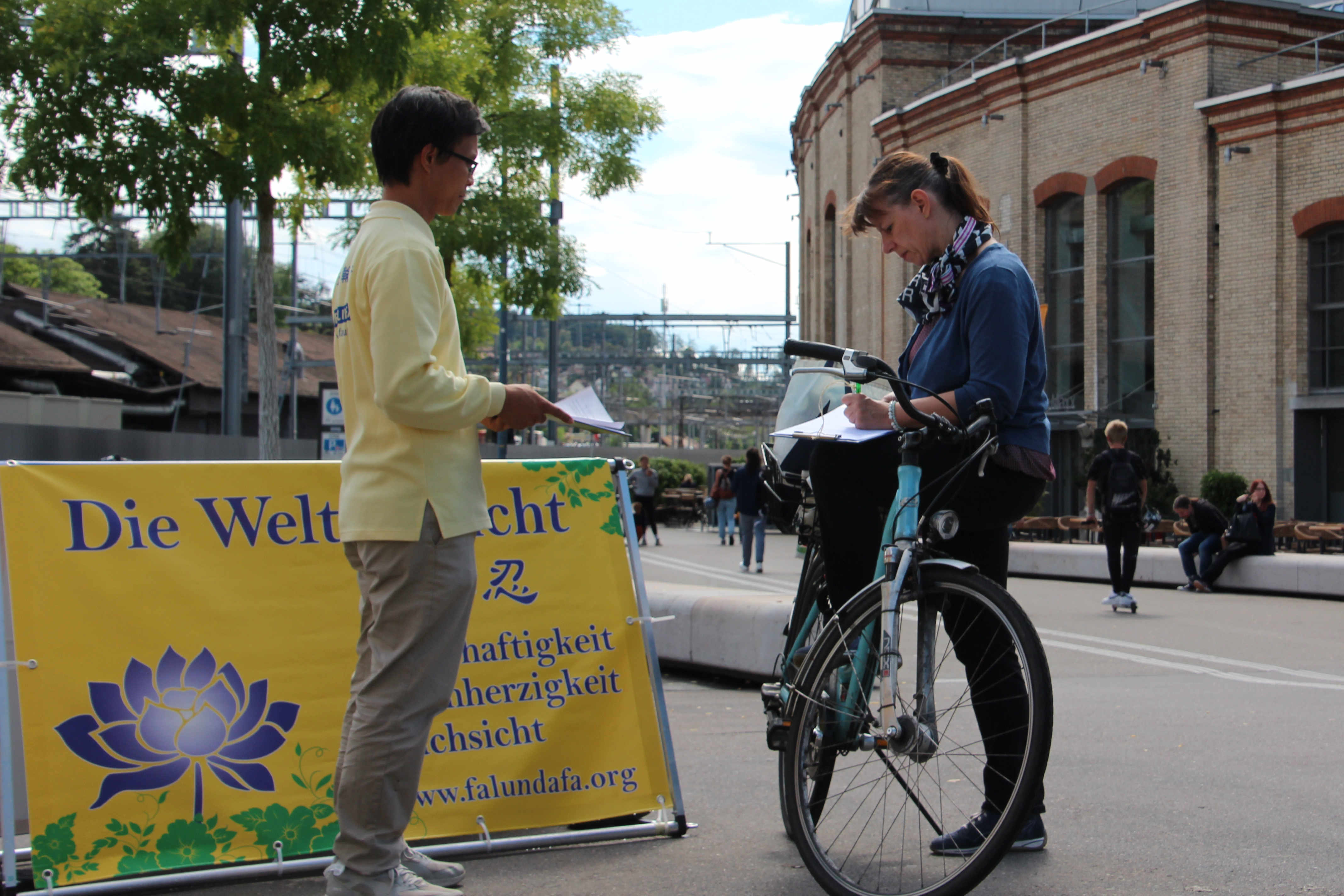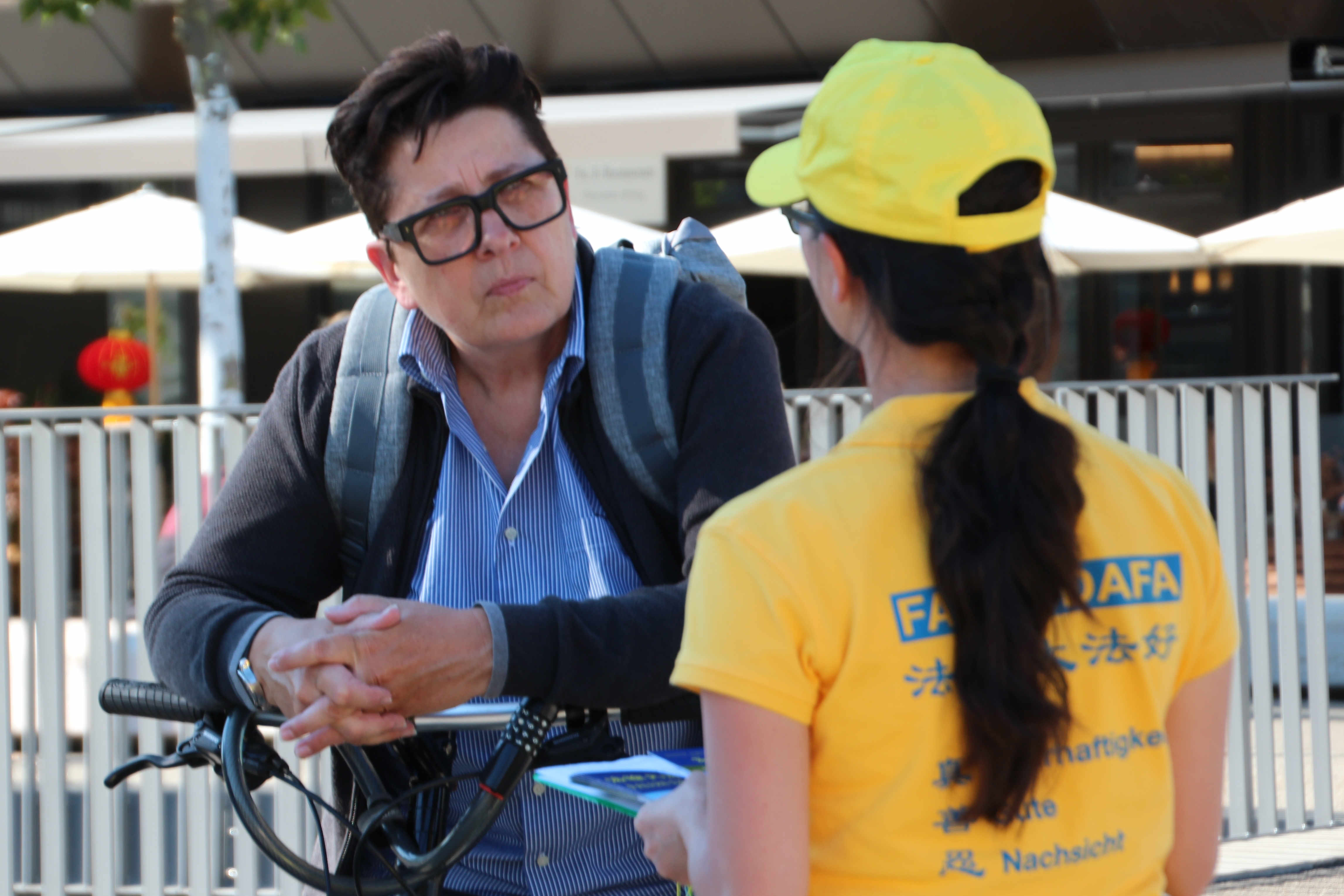 从事社会教育工作的苏珊娜·格伯(Susanne Geber)骑车经过法轮功学员的信息摊位,看到学员在分发资料,她停下自行车和学员交谈,认真听了学员讲述真相,并签名支持法轮功学员。