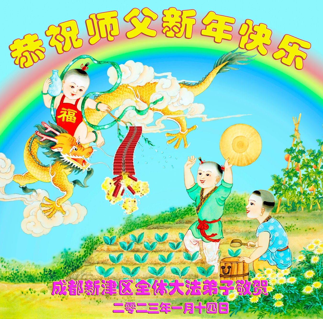 春雷炸响迎新春,山东省蒙阴县相邻的两个乡村的全体大法弟子恭祝师父新年快乐!