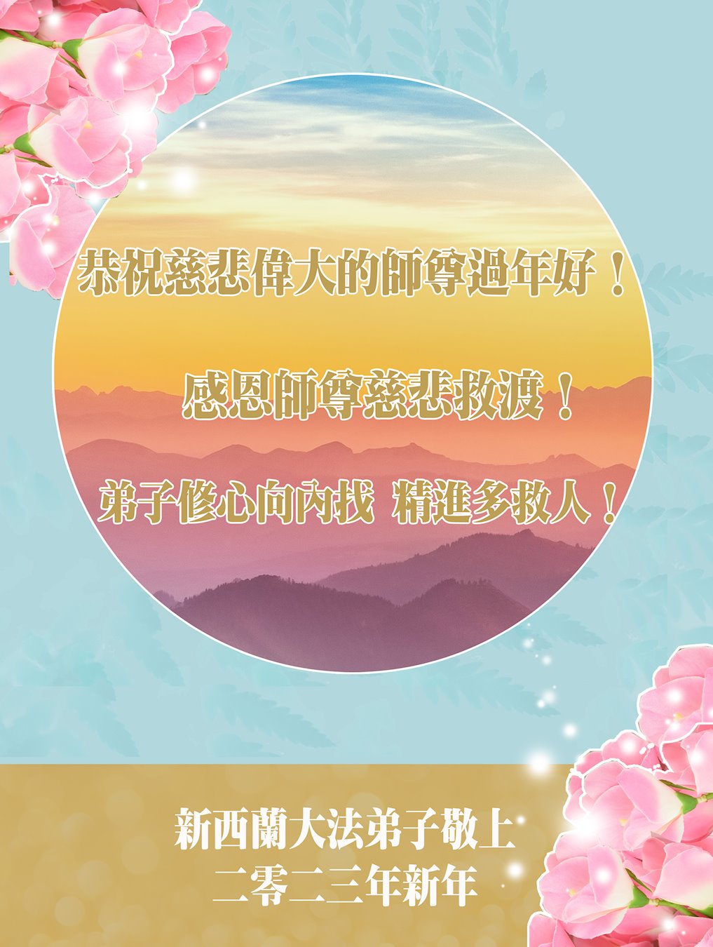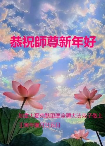 大法开启了我们的智慧,大法的法力让我们变的清醒和理智。使命让我们不再迷茫,我们会抓紧每个机缘去兑现我们的使命。新年来临,弟子们遥祝师尊过年好!