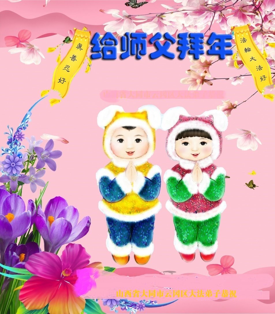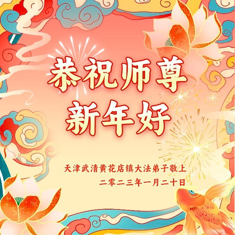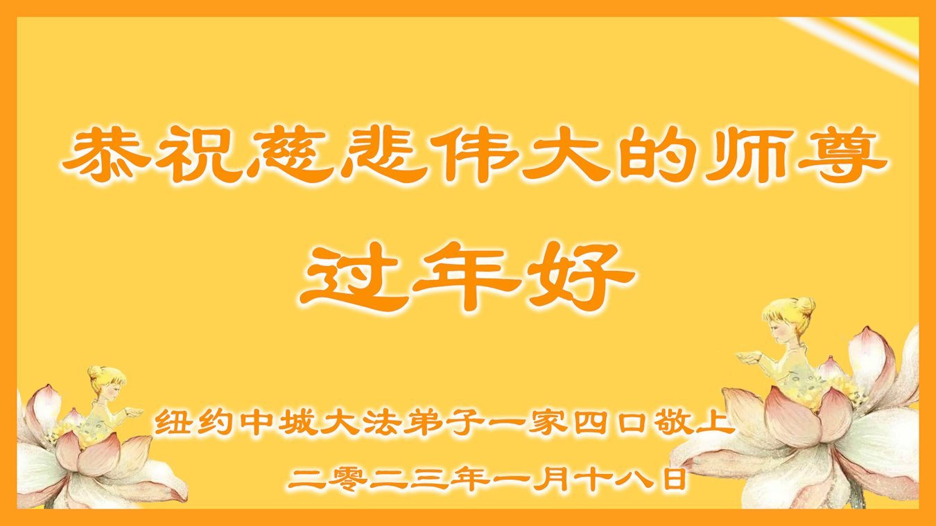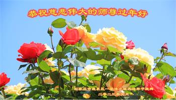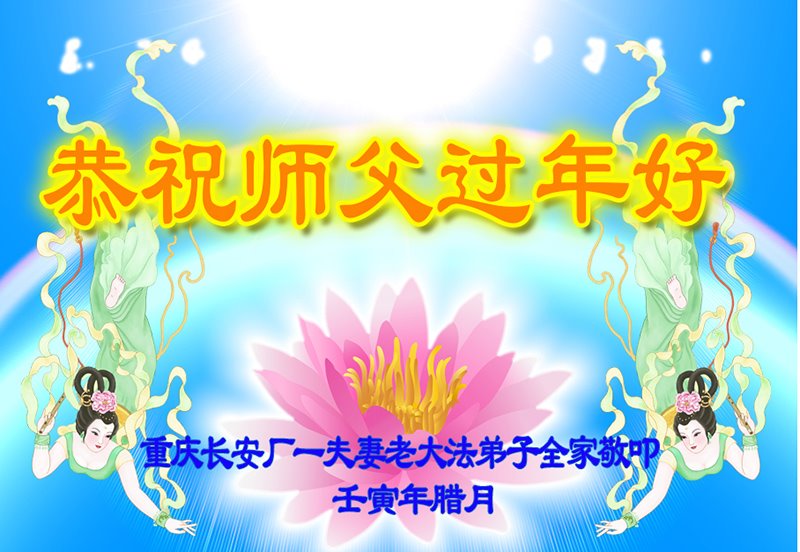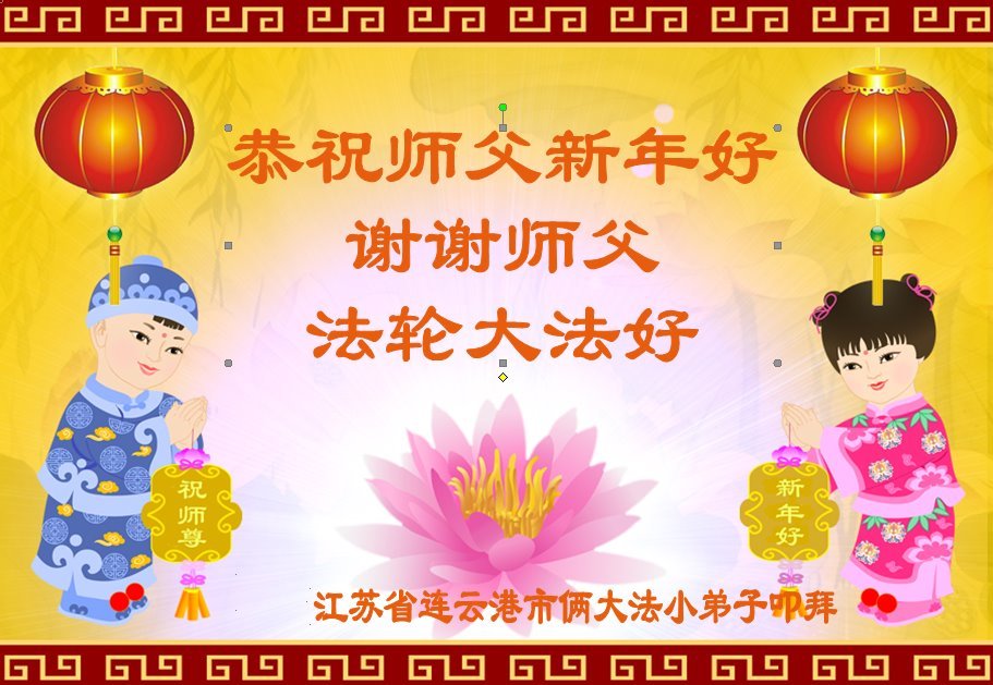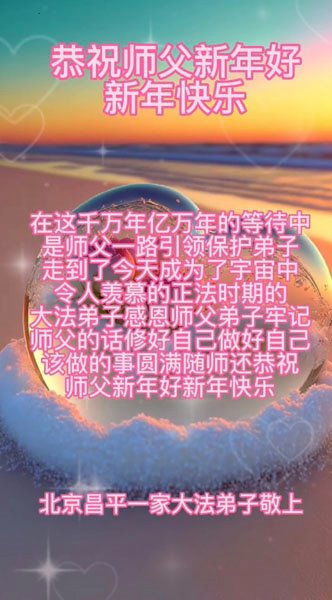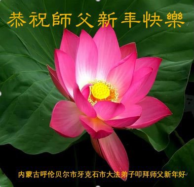 新年到来之际,我们夫妻俩老年大法弟子恭祝师父新年快乐!师父啊!弟子们想念您!助师救人是弟子们的使命不敢忘,待红魔除尽,解体恶党,法正人间迎师回中原!春回大陆师徒大团圆!