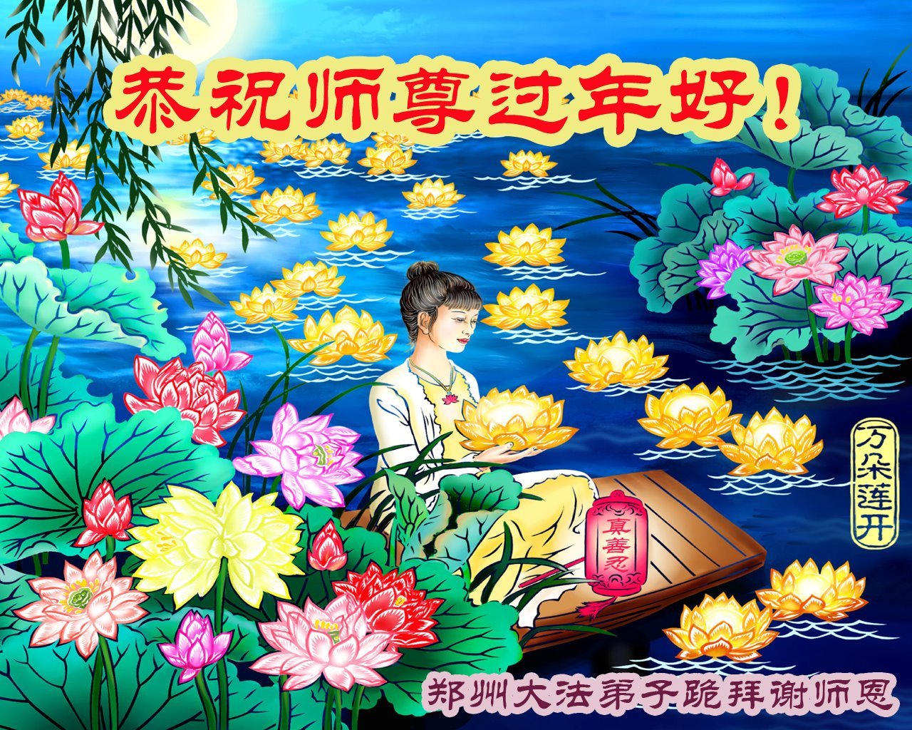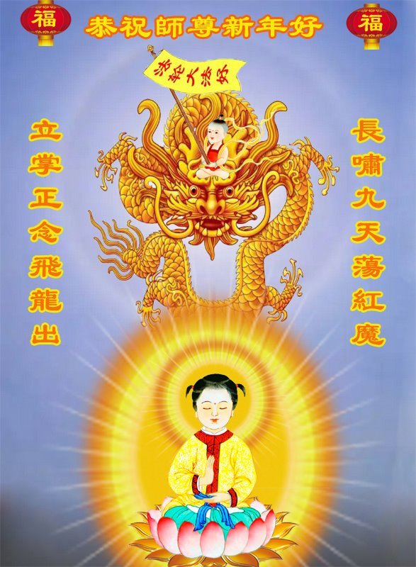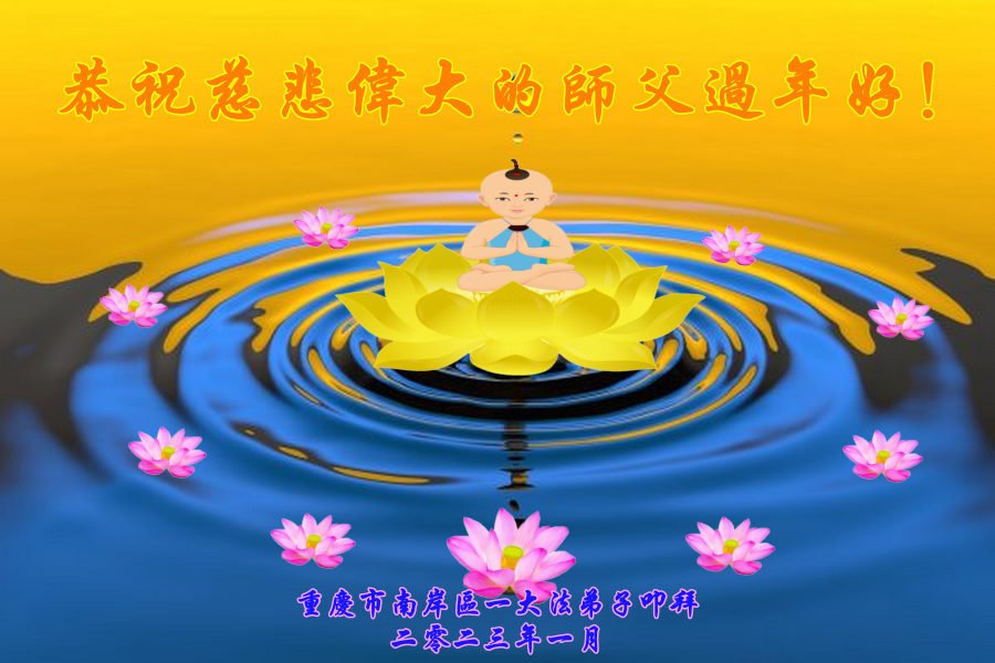 在这新年来临之际,弟子拜谢慈悲伟大的师父!师父新年好!师父新年快乐!弟子修炼十多年来受益良多,弟子没有珍贵的礼物敬献师尊,弟子只有感恩的心,谢谢师尊!弟子感恩师尊的慈悲苦度!慈悲的师尊您辛苦了!您的浩荡佛恩弟子无力报答,弟子要听您的话,走好您安排的路,做好三件事,要更加精進,圆满随师还。