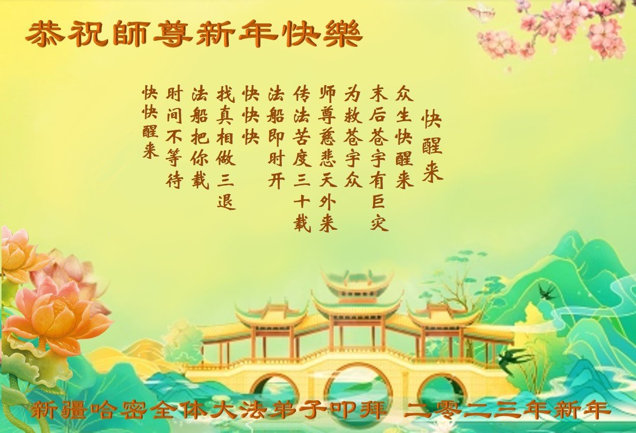 辞旧迎新我们又迎来新的一年2023年。在新年到来之际,谢谢师尊浩荡洪恩!慈悲苦度!我们要谨遵师尊教导,以法为师,精進实修,珍惜这万古机缘,我们一定要勇猛精進。在大疫当前我们一定要抓紧时间。多学法,学好法;多救人,快救人,整体配合,共同提高,走好、走正最后的修炼道路,紧紧跟上正法進程,不辱使命、兑现誓约,圆满随师还!感恩与师尊同在,感恩与大法同在。珍惜这万古机缘,比学比修共精進。风雨无阻救众生,与师尊早日团聚。