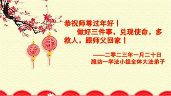 山东省诸城市坚持讲真相的八十九岁大法弟子说:“我听师父的话,参加集体学法,外出当面讲真相救人。新年到了,我真诚的问候师父好,祝师父节日愉快!”
