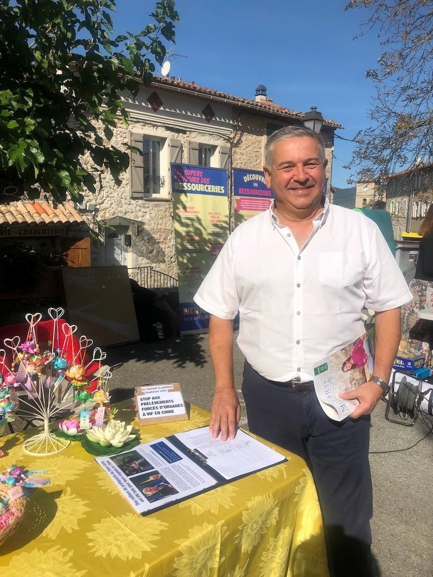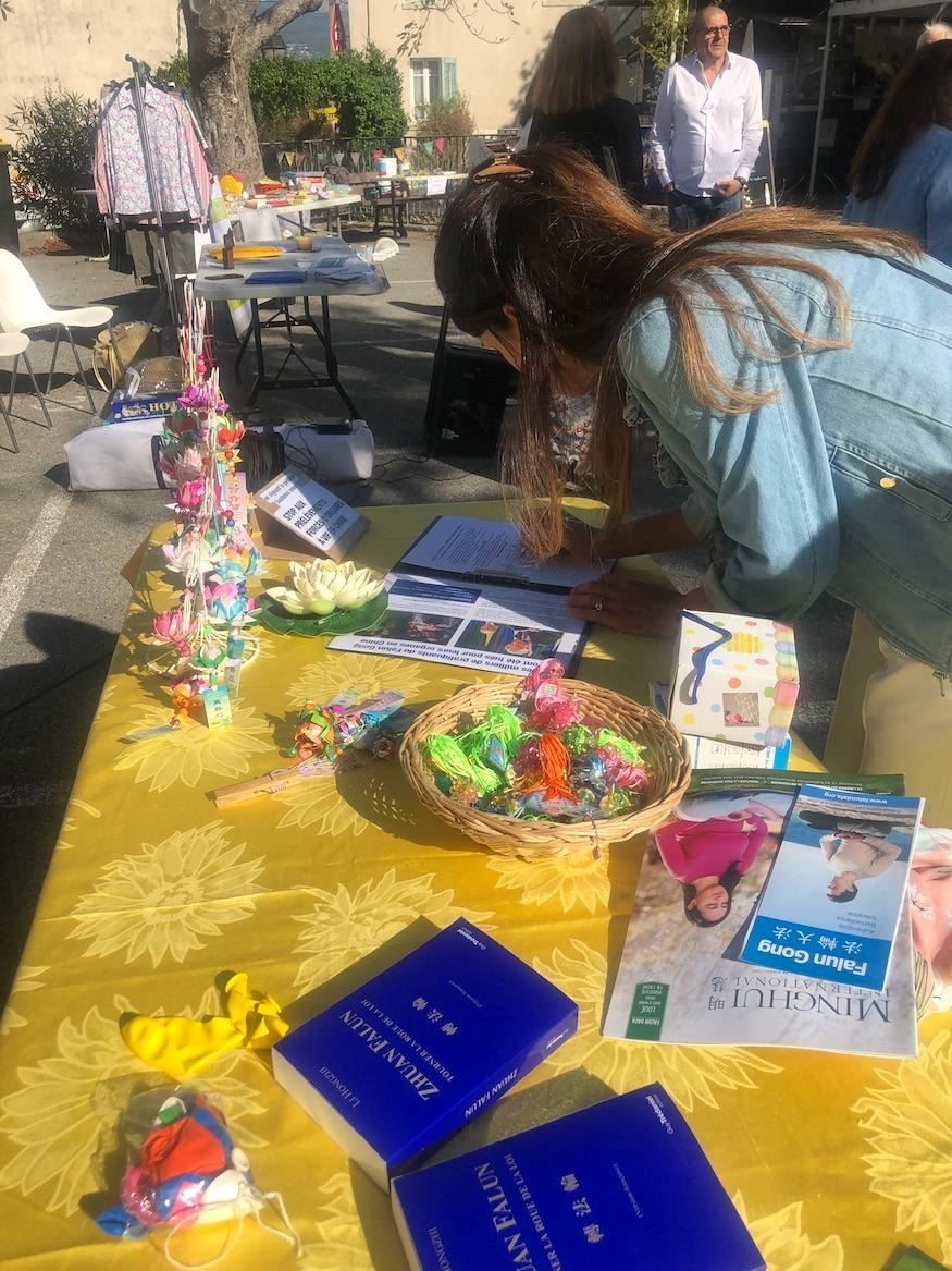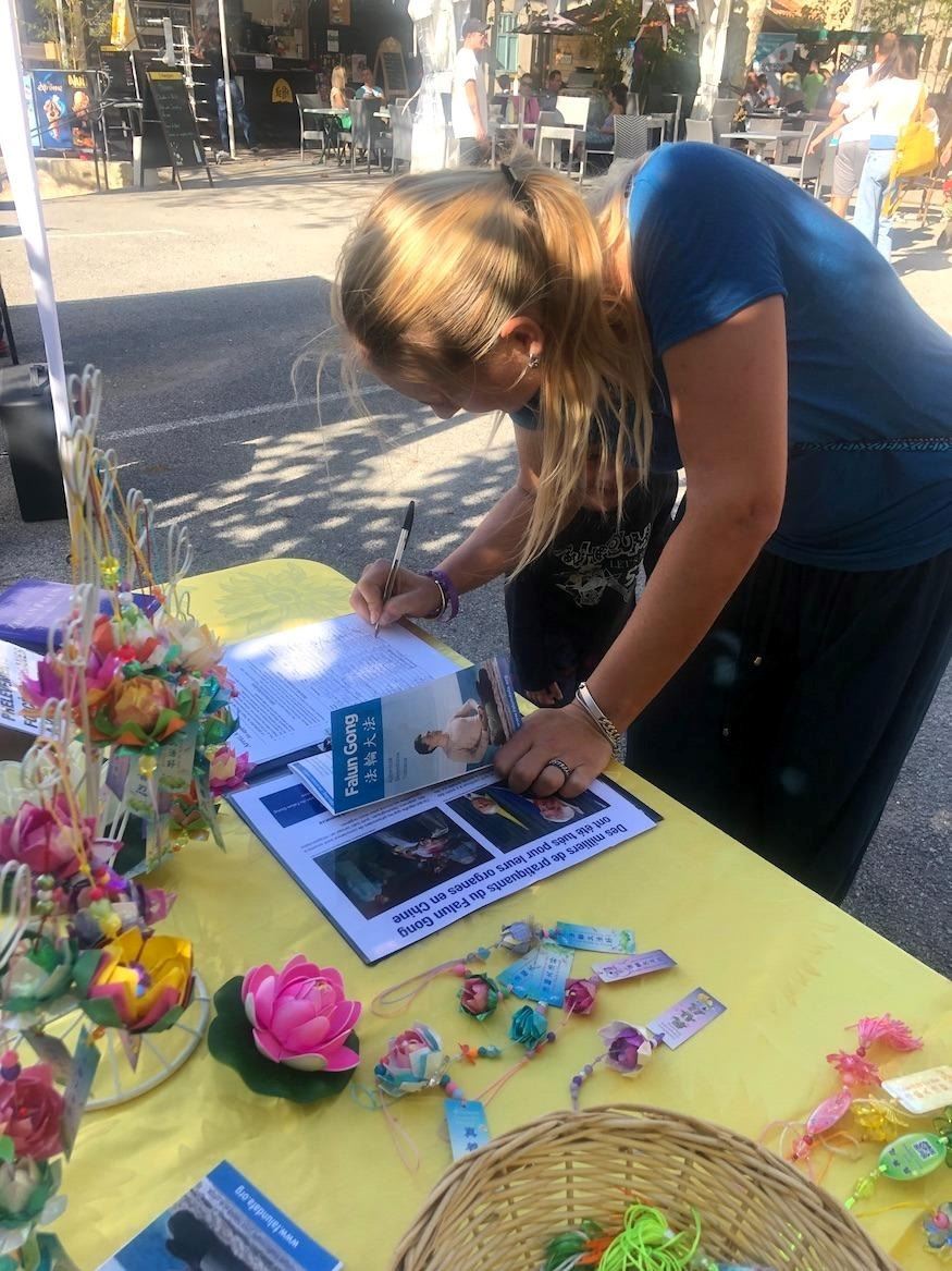 镇长尼古拉-马特尔(Nicolas Martel)走近法轮功展位,法轮功学员向他介绍了法轮功在中国被迫害的情况。他很震惊,立即在反迫害请愿书上签了名。