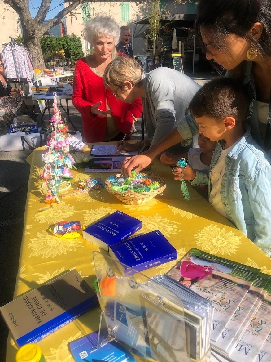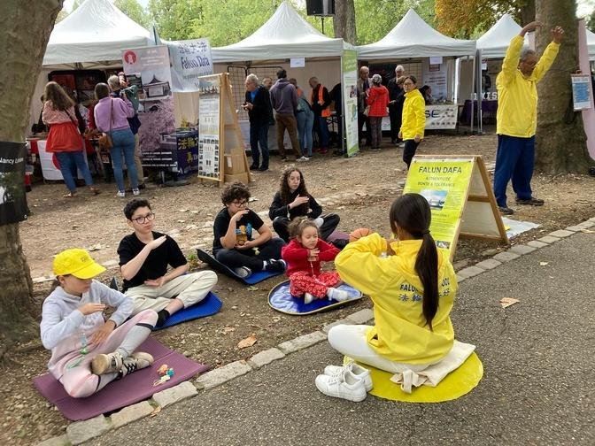 九月二十三日,法轮功学员还参加了在法国南锡(Nancy)佩皮尼耶尔公园(Parc de la Pépinière)举办的协会日活动。法轮功展位前人头攒动。许多人驻足了解法轮大法修炼功法,及修炼人必须遵循的准则,以及中共对修炼人的迫害和强摘器官的罪行。