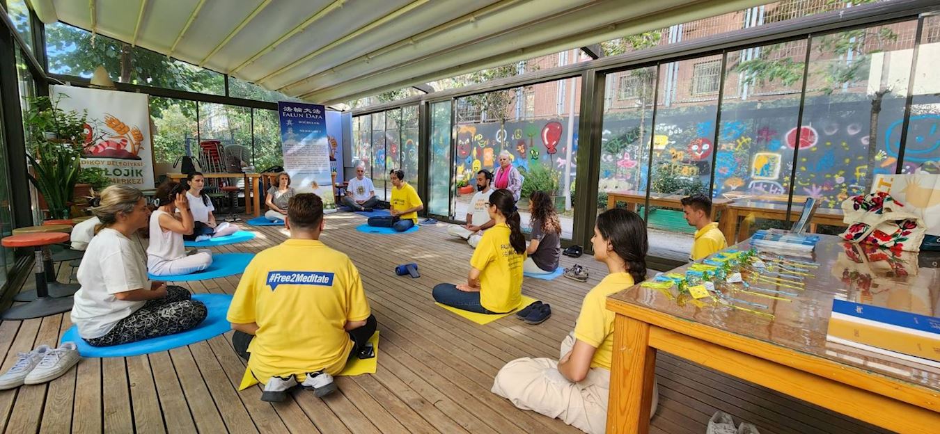 二零二三年九月九日星期六,法轮功学员在伊斯坦布尔卡德柯伊(Kadıköy)的“生态生活中心”举办弘法活动。