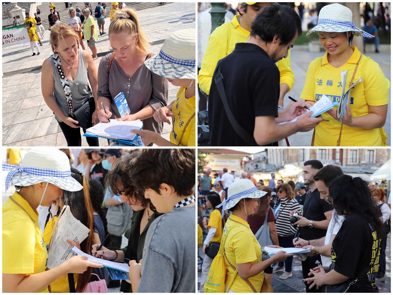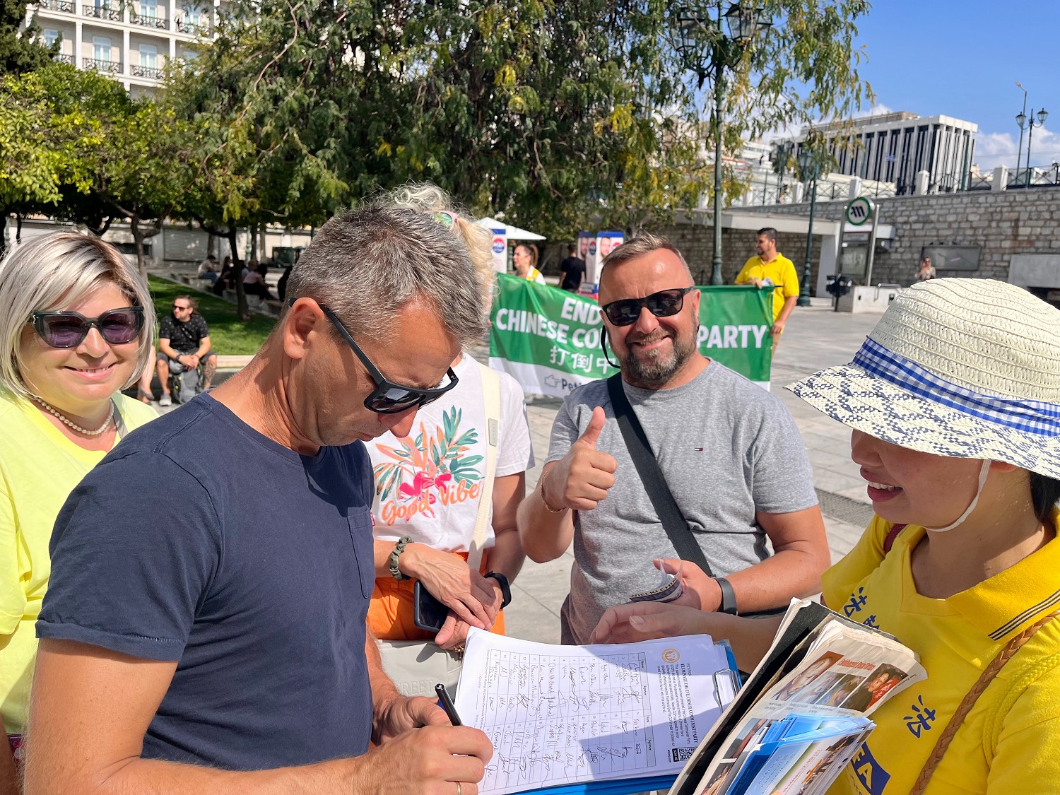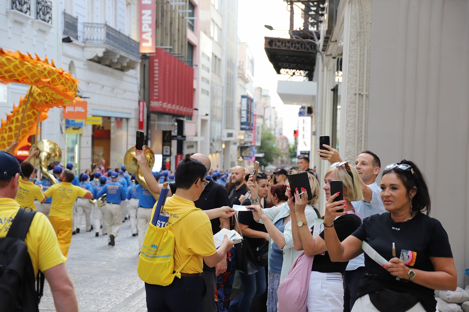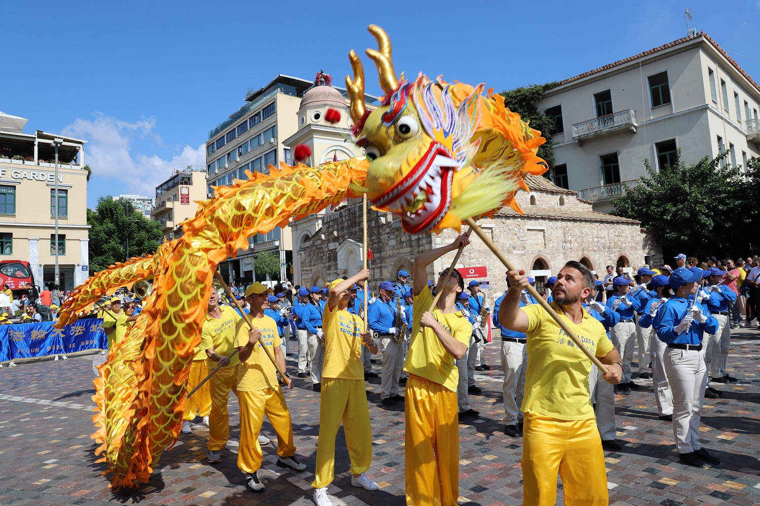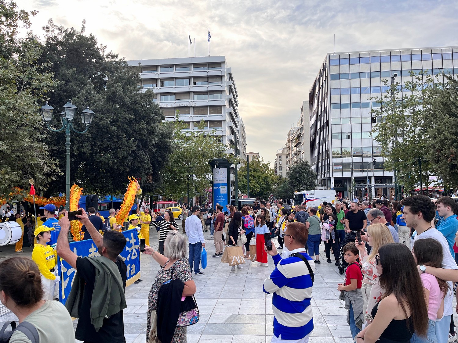雅典各个广场上都挤满了人群,看到天国乐团和舞龙队的表演,大家纷纷拍照、喝彩。很多人在了解到中共迫害法轮功学员的罪恶之后,纷纷签名声援学员反迫害。