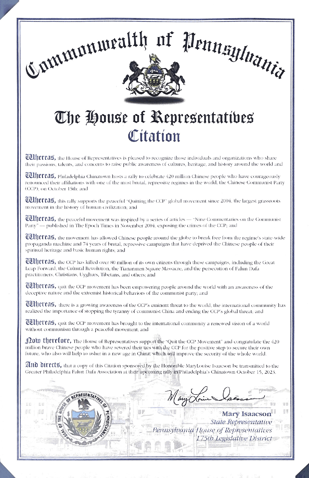 宾州众议院为法轮功学员当天的活动发来了褒奖信,由州众议员玛丽・艾萨克森(Mary Isaacson)签发。
