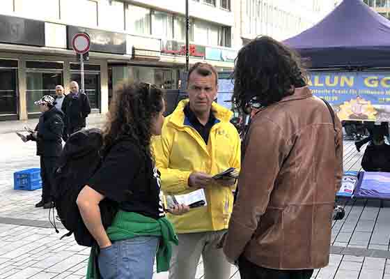 十月二十一日,德国杜塞尔多夫及周边地区的法轮功学员在市中心繁华的步行街上搭起真相点。学员们演示了五套功法,并向人们介绍法轮功。