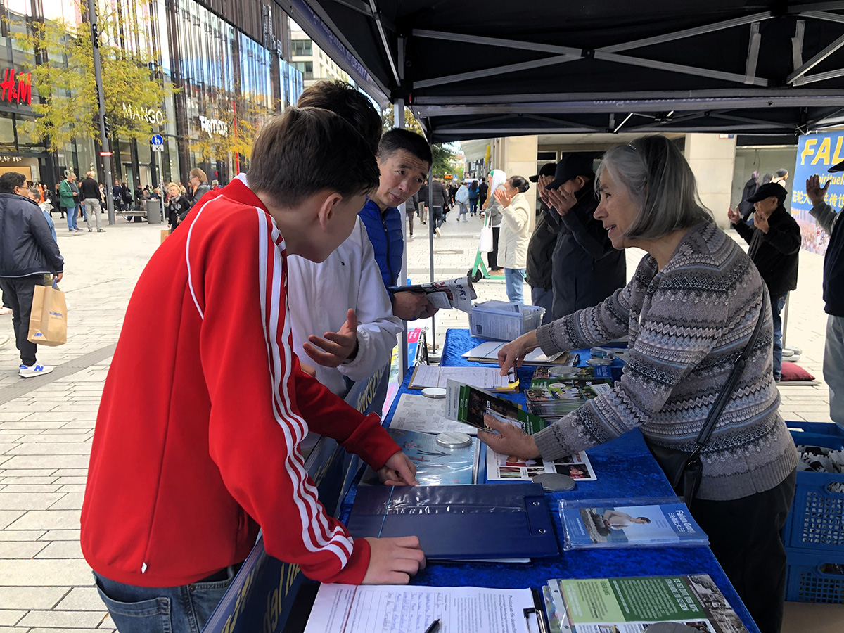 她们告诉学员,自己是来德国出差的,在中国听说过法轮功,但是对迫害并不了解。其中一位女士非常认真地读了展板上的内容,还用手机为介绍五套功法的展板拍了照。当学员告诉她们,所谓的天安门自焚事件是中共的谎言宣传时,两人都点头表示同意。