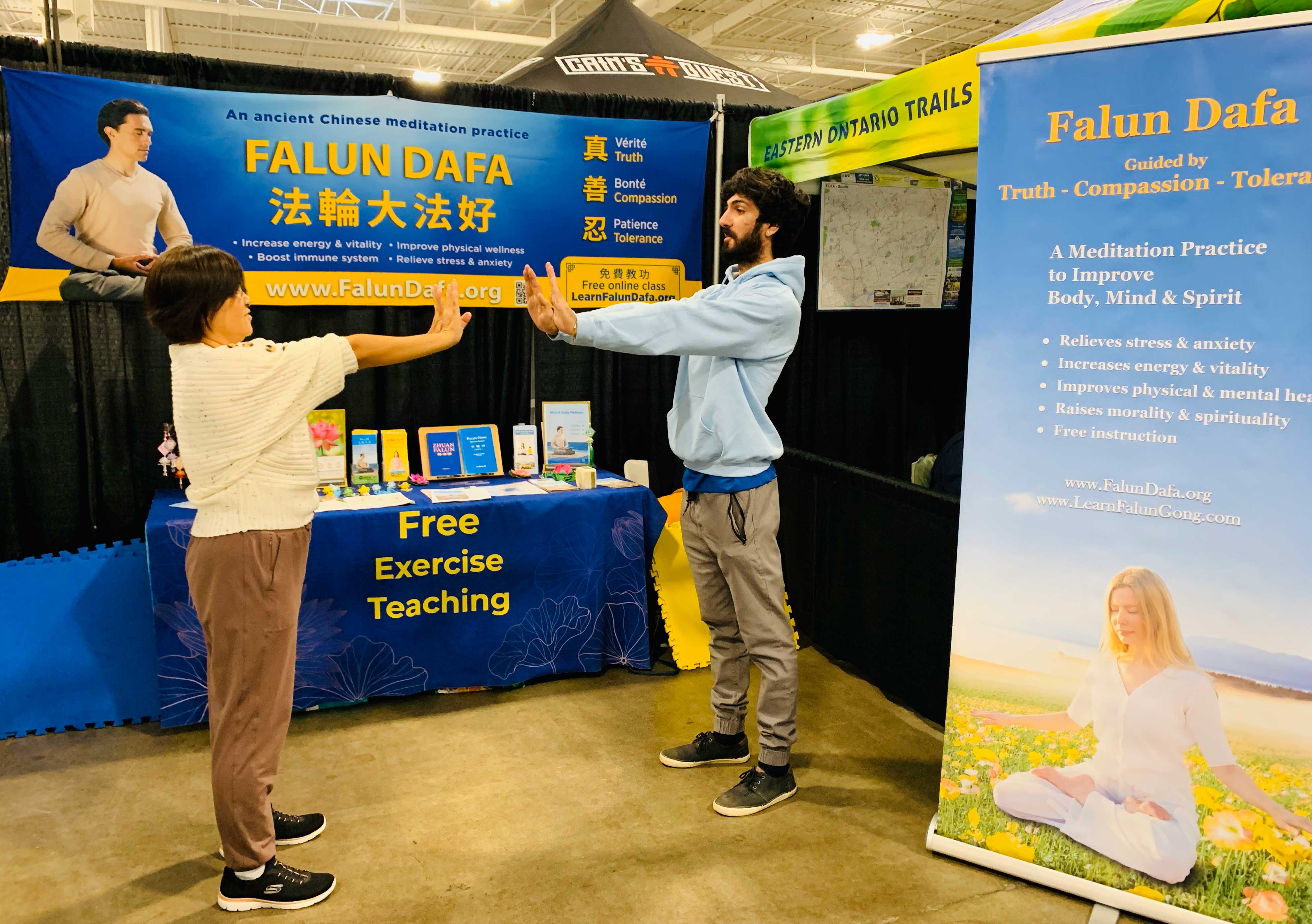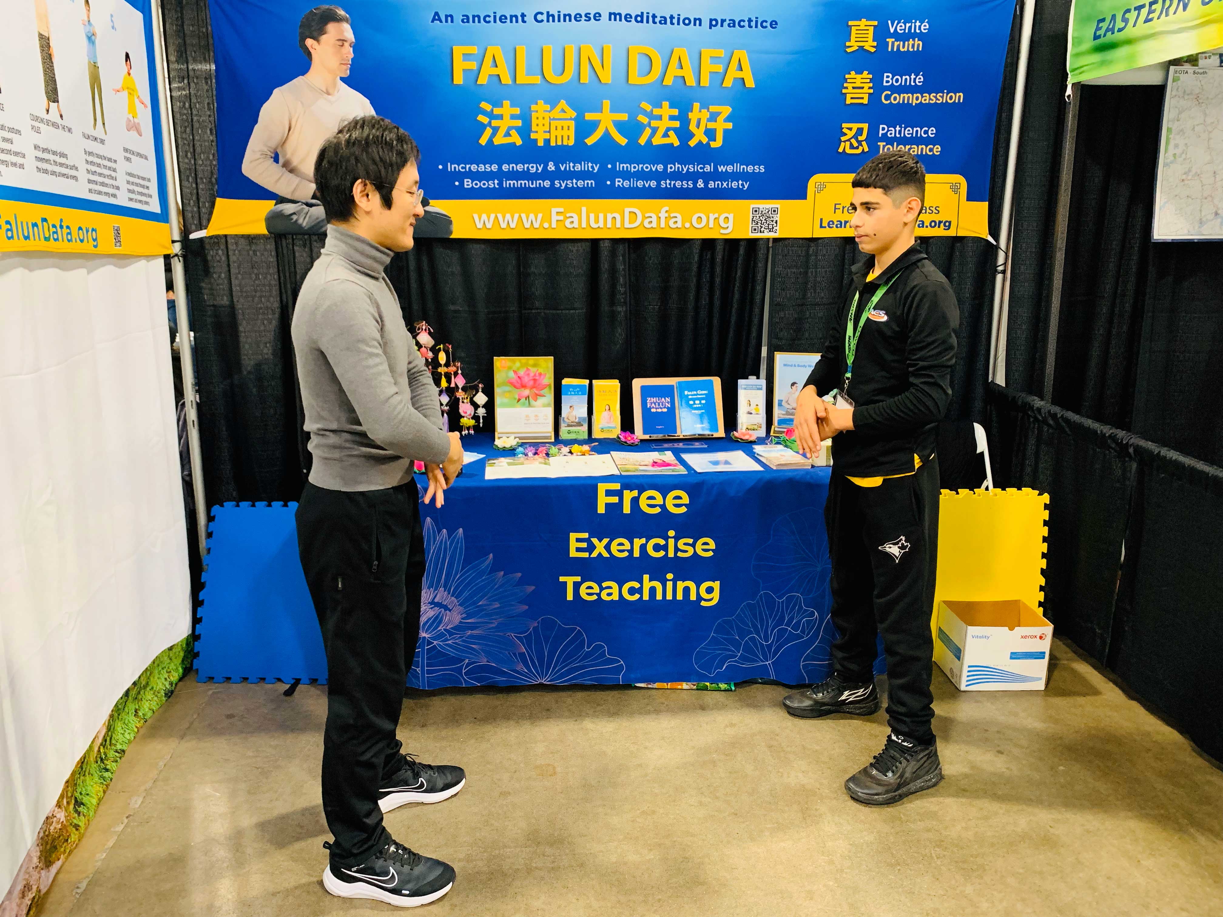 阿里(Ali)是一名学生。他之前经过大法展位时,看到了功法的介绍,阅读了展板上的内容。当他再次路过展位时,主动走了过来,告诉学员想要学功。