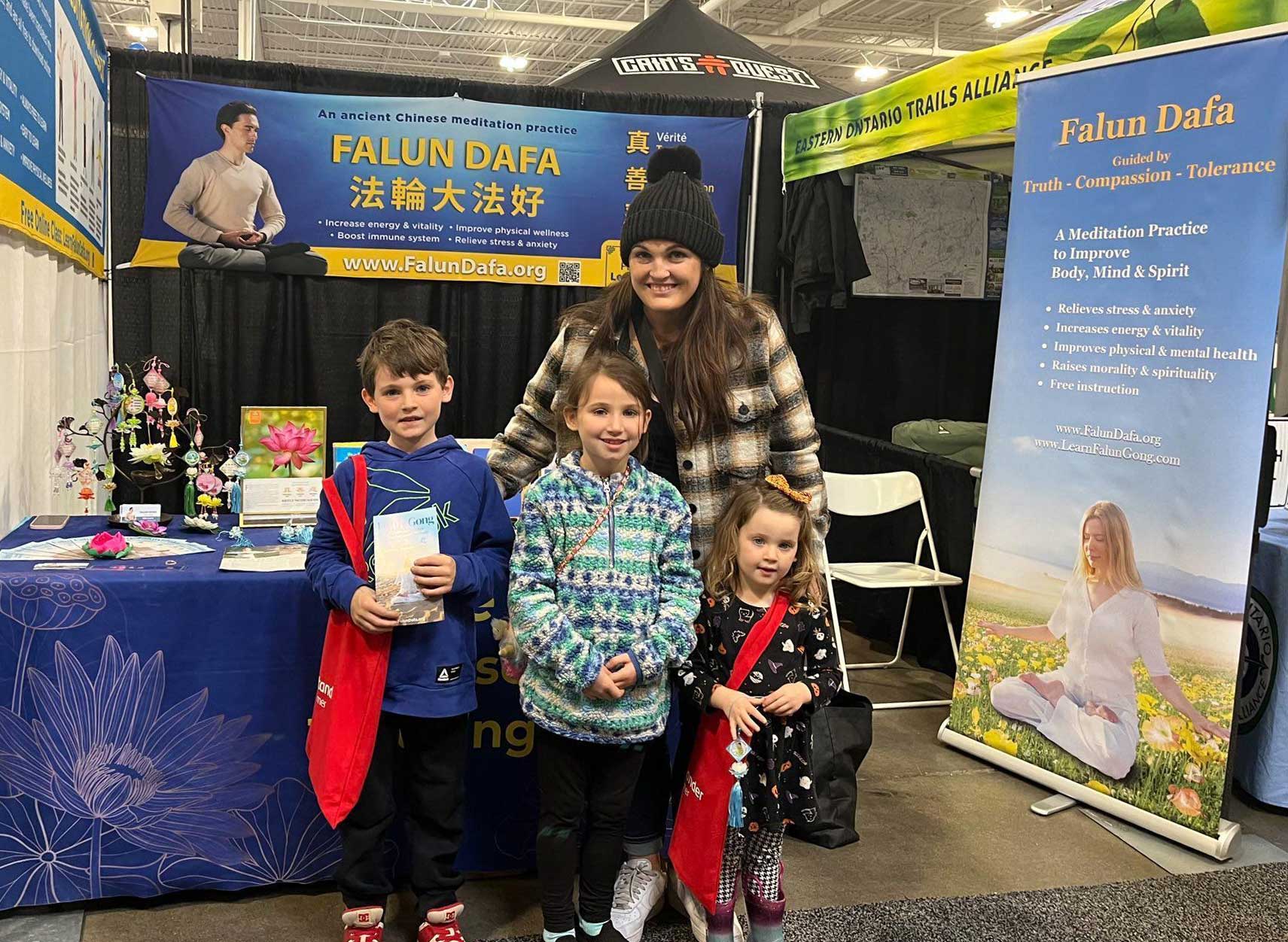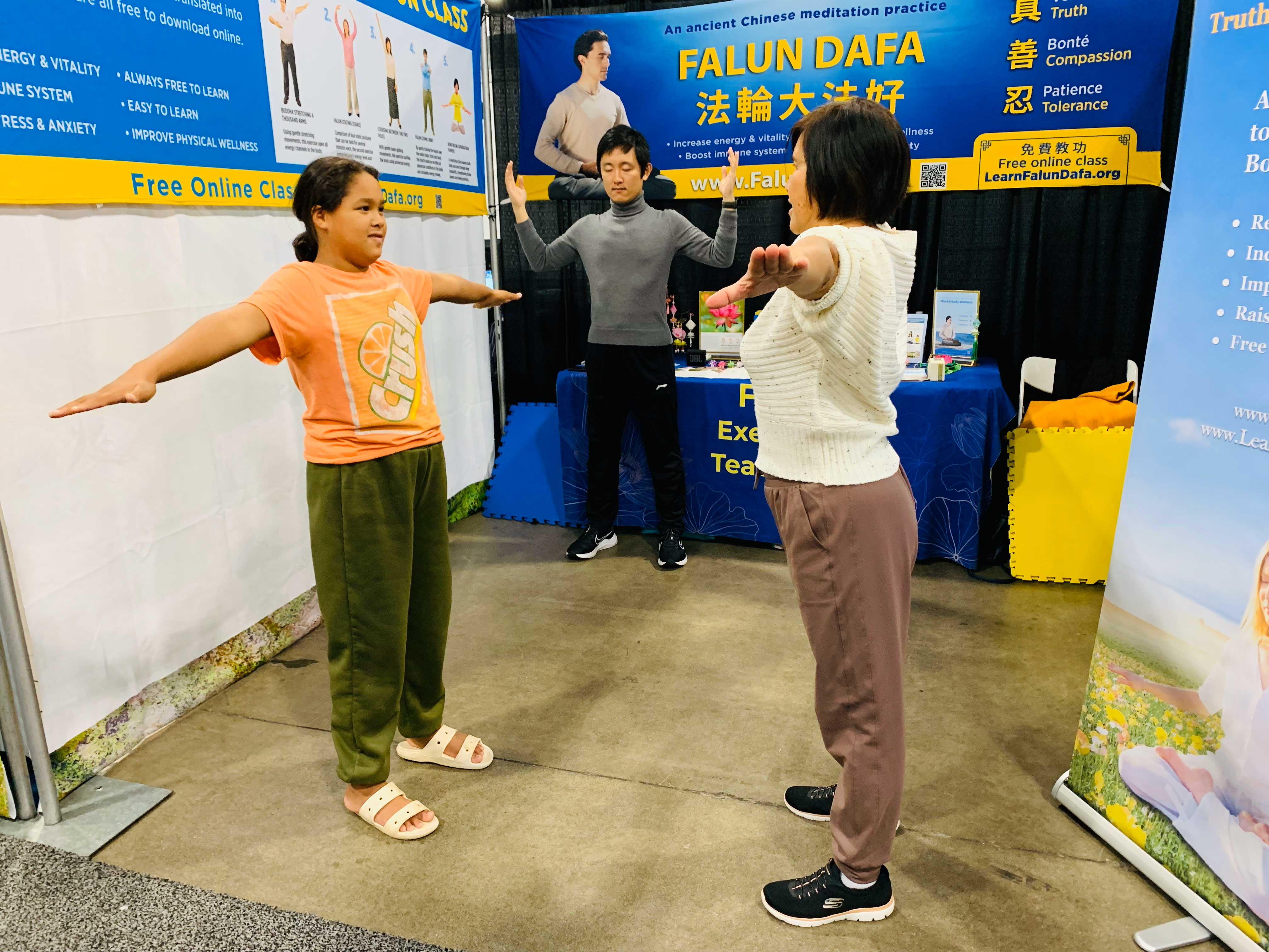 阿什莉(Ashley)带着三个孩子来到展位前。她的孩子们看到学员炼功的场面,停下来观看。学员向阿什莉和孩子们介绍的时候,孩子们想要学习,于是学员教了他们功法。