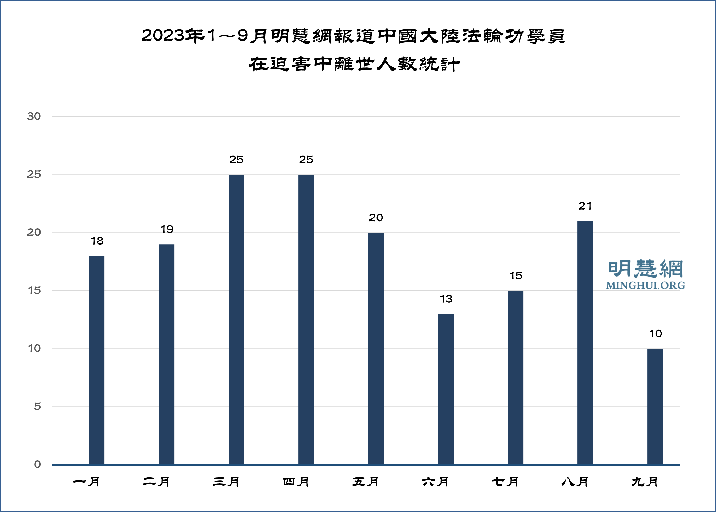 据明慧网报道统计,九月份获知有10位法轮功学员被迫害离世,其中湖北两人,内蒙古两人,吉林、广东、江苏、辽宁、陕西、四川各一人。