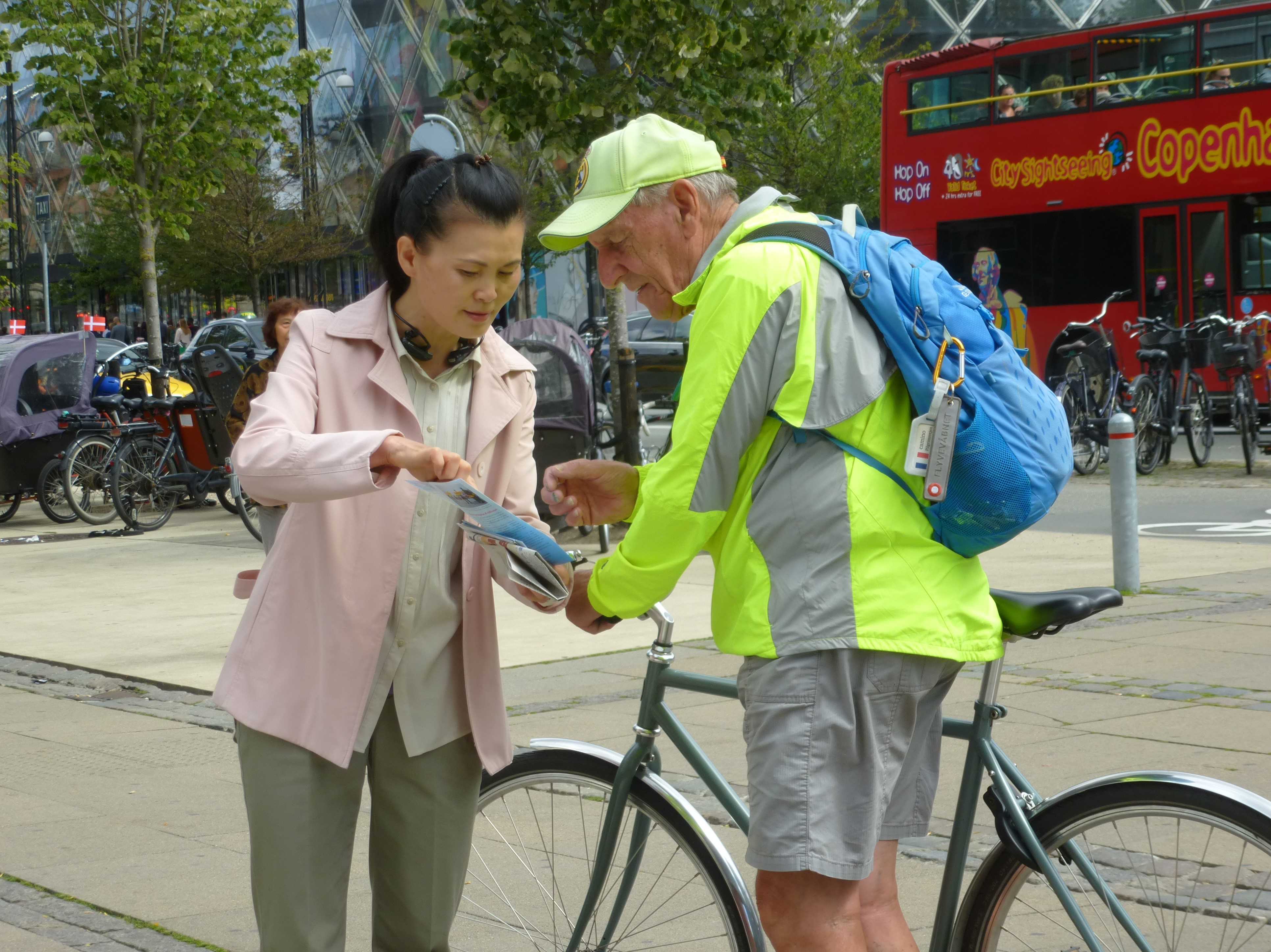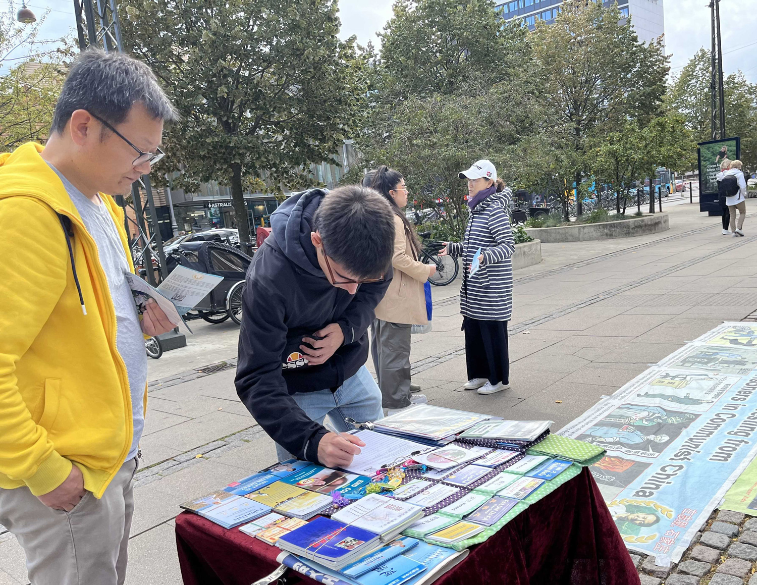 一位来自丹麦博恩霍尔姆岛(Bornholm)的女士,当她听闻真相后,马上在解体中共的征签表上签名。她说:“你们还有其他资料吗?我想多带一些回去,给我身边不知道这些事的人们。”她还说:“我的先生在那边,我去告诉他,让他也来签名。”不一会,她和先生来到了签名桌旁,等她先生签名后,两人再次表示对学员的支持后才离开。