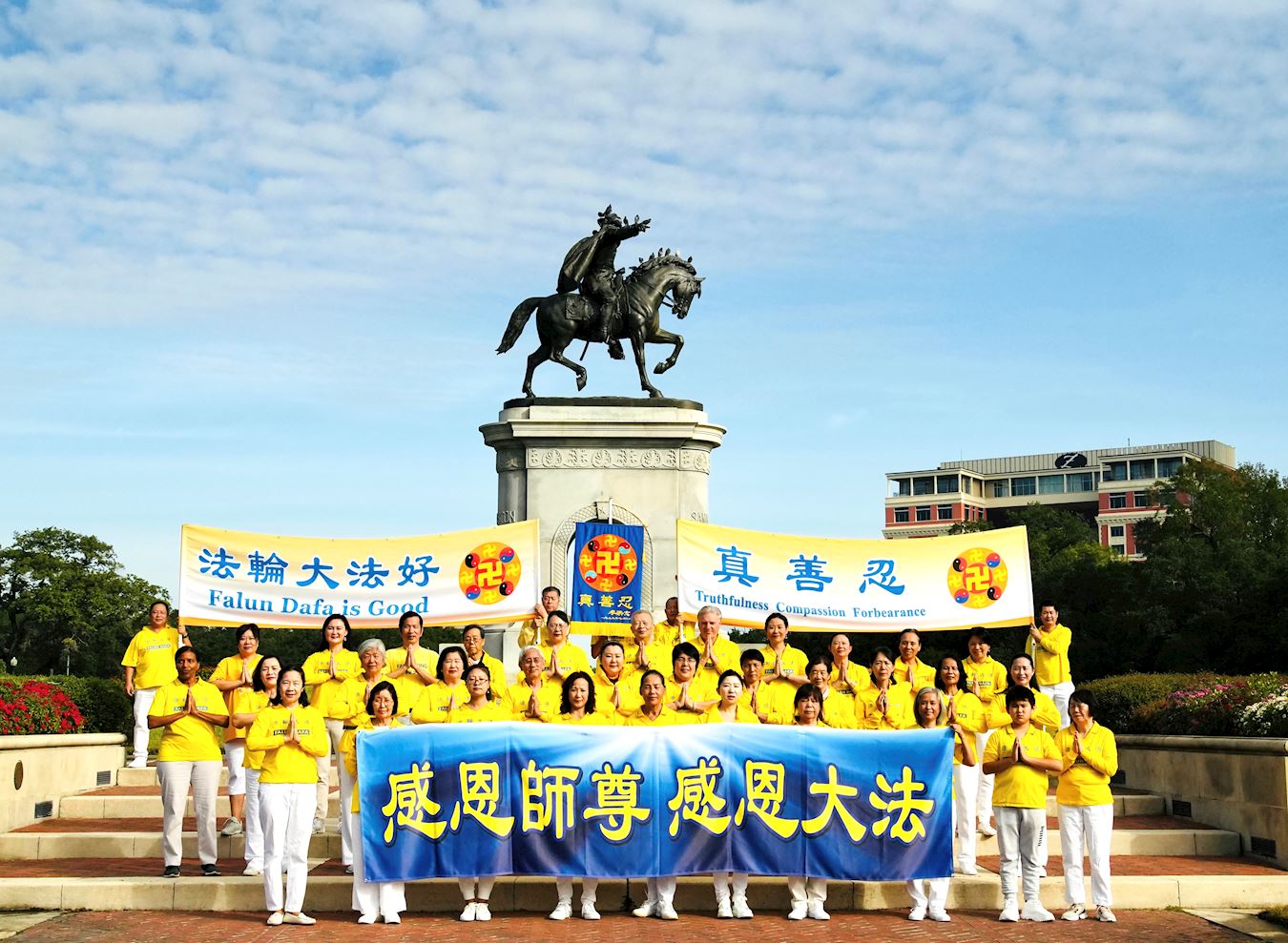 我感觉那喊声响彻云霄!我的汗毛孔都开了,血往上冲。我觉的我的脸都红了,伴随着泪水,脸热热的。不到两分钟,多个警察冲上来,抢走了横幅。女儿的手被一个警察扭到背后,嘴被警察用手捂住,我大声喊:“放开孩子!”这时,广场上不同地点都有同修站出来打横幅,喊声此起彼伏,真是震撼人心。