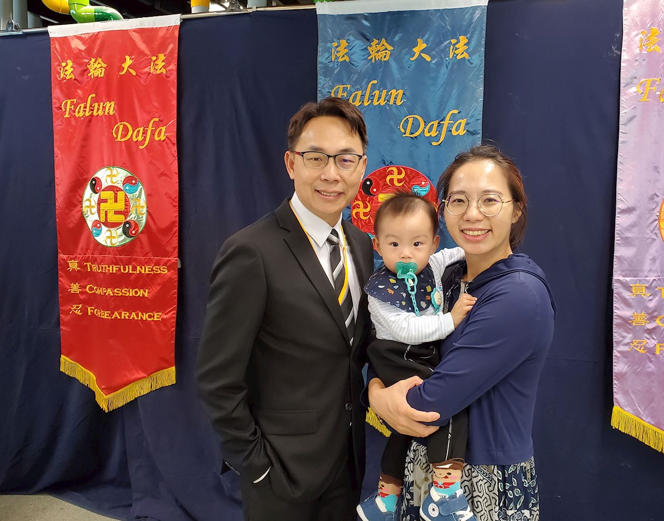 图3:刘秉华和妻子与孩子一同参加法轮大法修炼心得交流会。