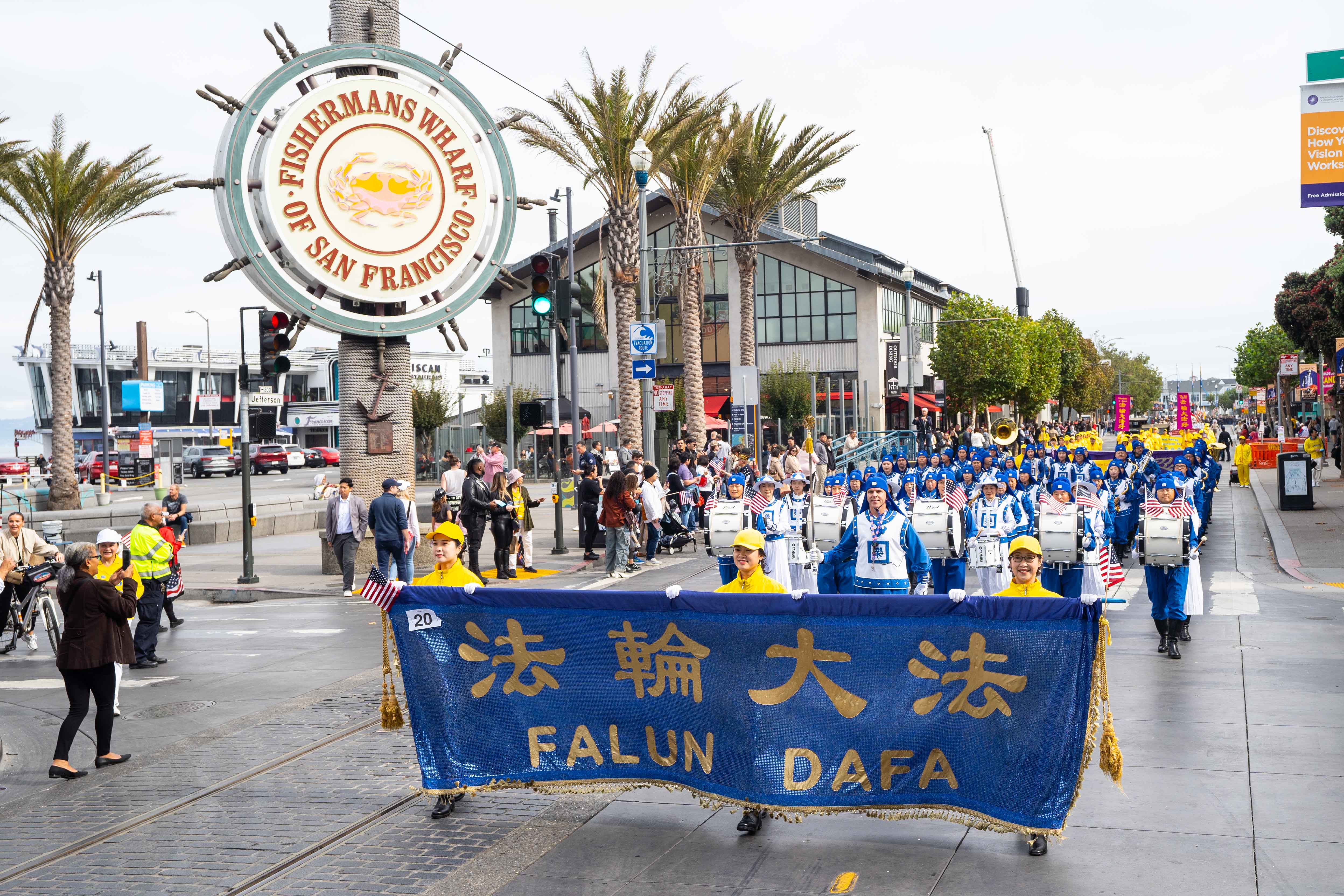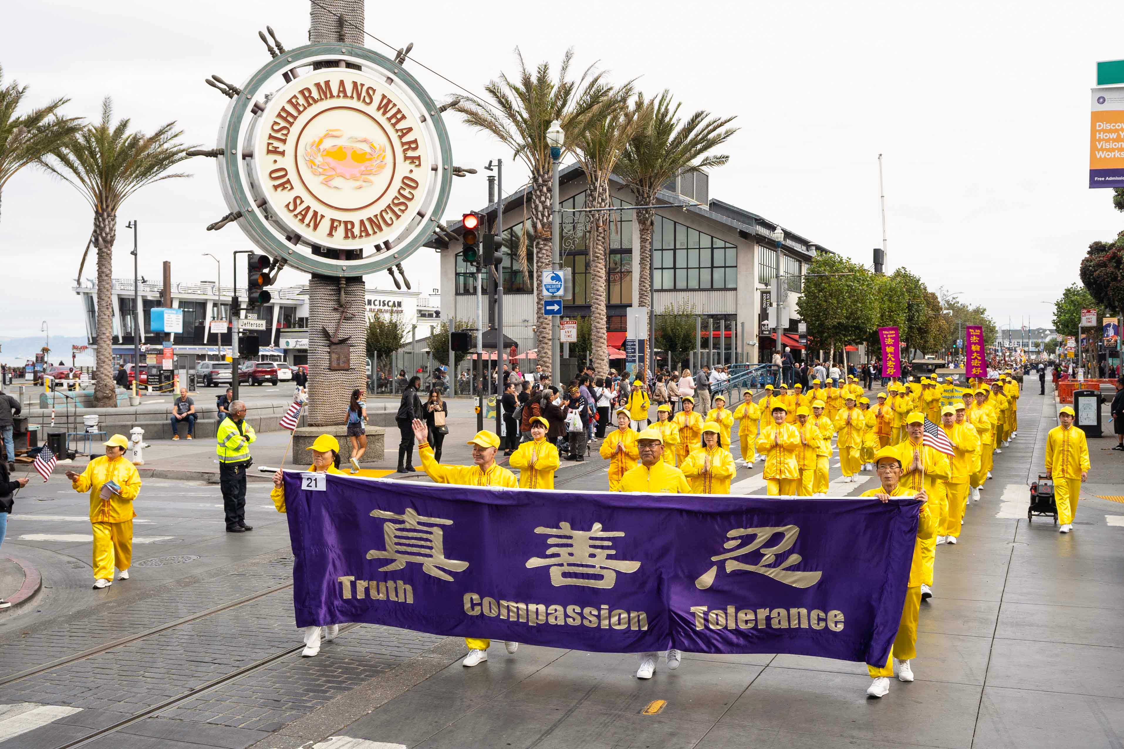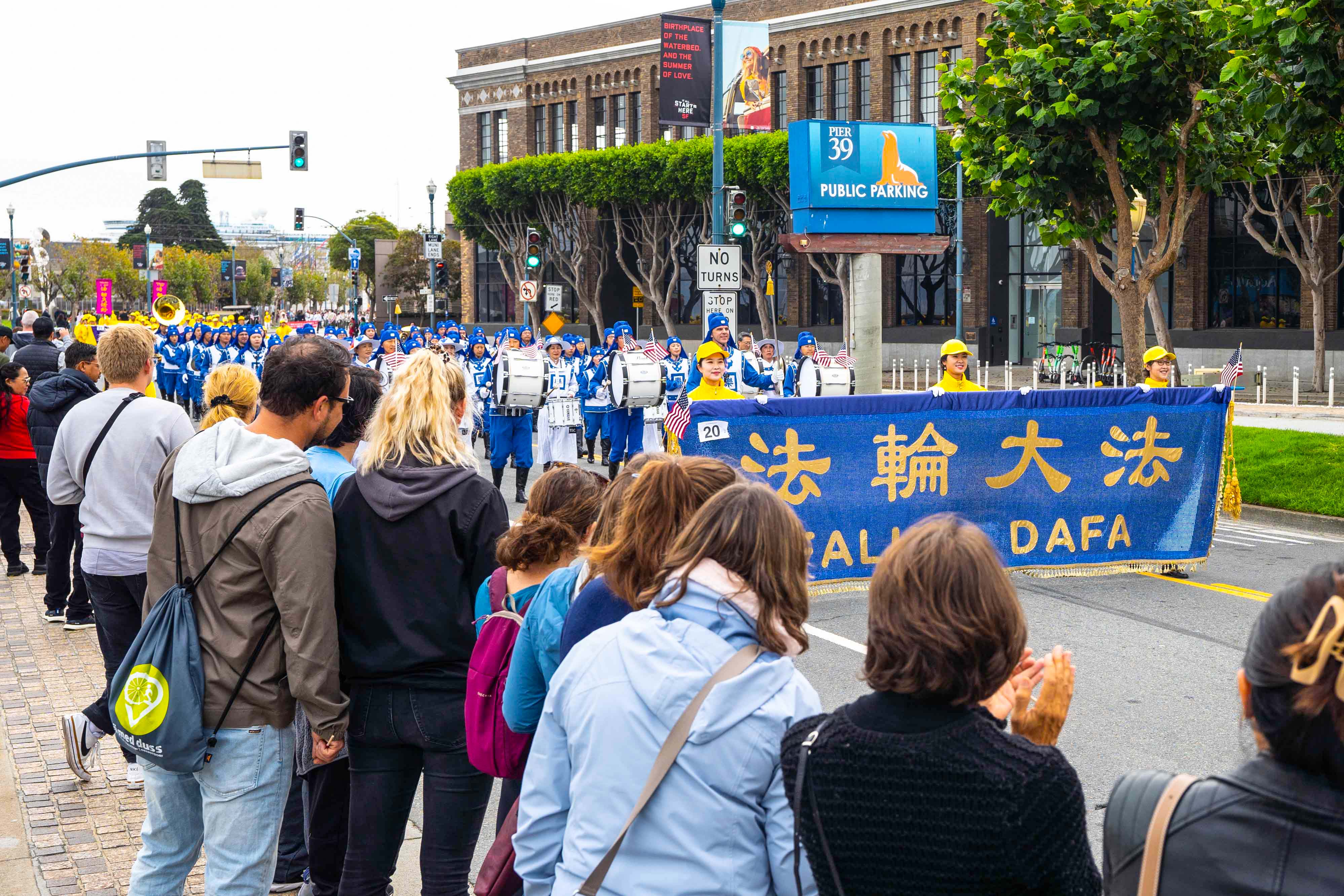 法轮功学员的队伍由美西天国乐团和炼功队组成。天国乐团为观众带来了《法轮大法好》和《美国国歌》等乐曲,受到观众的欢迎。有的观众看到法轮功学员的队伍热烈的鼓掌;有的挥手致意;有的随着天国乐团演奏的乐曲歌唱。美国军人听到天国乐团演奏的《美国国歌》时,伫立并行军礼。