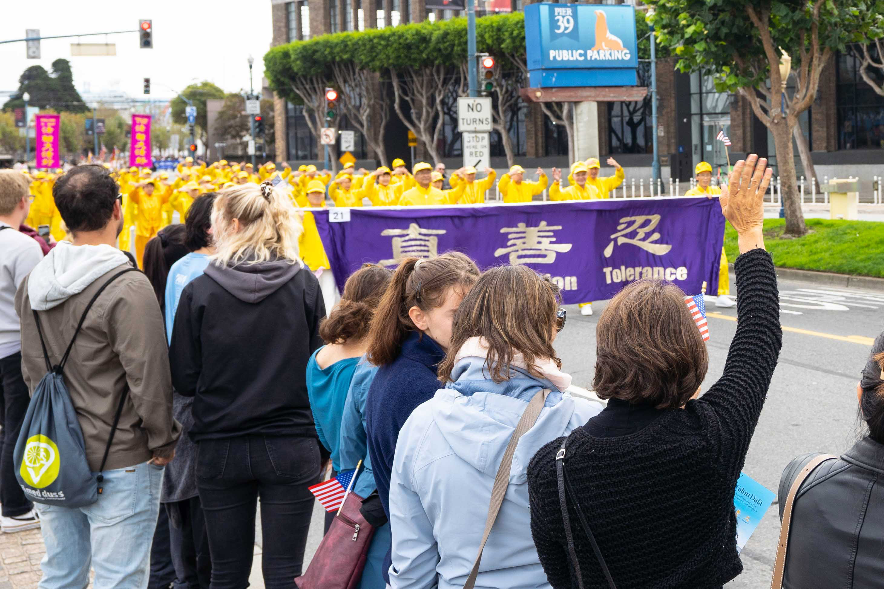 带着女儿来观看游行的东湾观众辛西娅(Cythia)说,天国乐团演奏的乐曲让她感动,“他们的演奏让我落泪。”“我喜欢真、善、忍原则。”她表示,她还看到了法轮功学员的炼功队,“我认为我们的世界需要真、善、忍原则。”