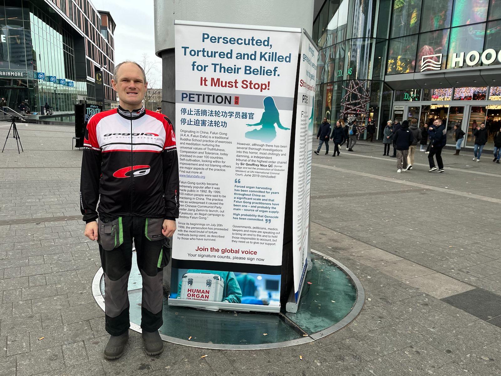 赫尔辛基市民马尔科(Marko)站在活摘器官的海报前认真地看着,并拿出手机拍照,记录这次活动。他对中共活摘法轮功学员器官的规模之大表示气愤。他对西方国家因为经济利益而不作为,媒体不报道感到不解。