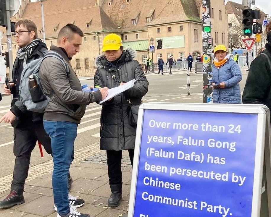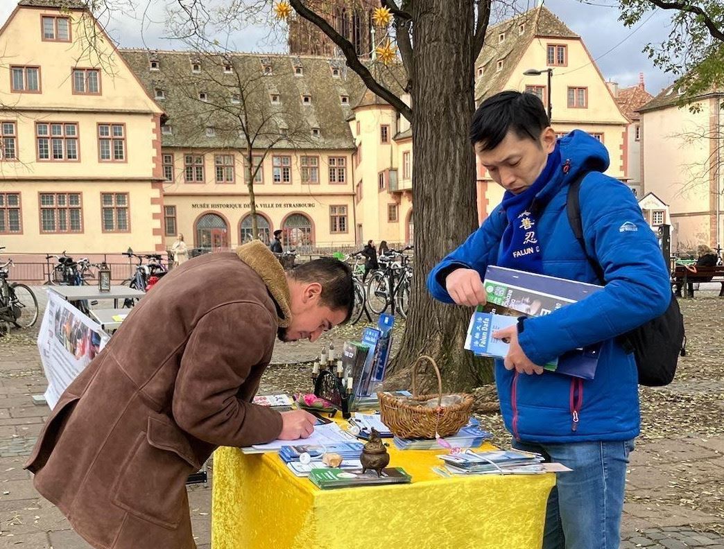 斯特拉斯堡圣诞市场是欧洲最古老的圣诞市场之一,每年有两百万人光顾。时值圣诞节前夕,到访者源源不断。许多人对中共活摘法轮功学员的器官感到震惊,他们纷纷签字支持学员的反迫害行动。人们在展位边驻足,说:“你们做得好,很勇敢,请继续努力!”还有的人当场学炼了法轮功五套功法。