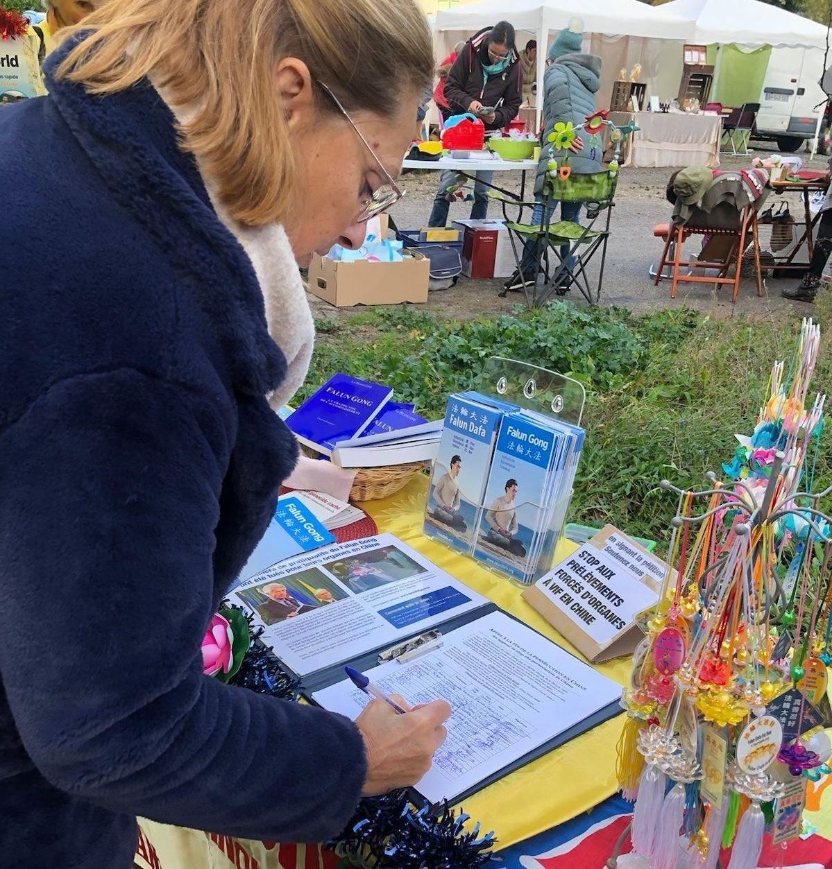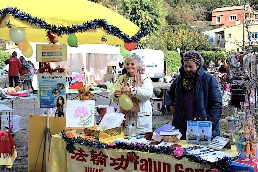 与此同时,十二月九日,在法国南部地中海边的滨海阿尔卑斯省(le département des Alpes-Maritimes)滨海卡涅市(Cagnes-sur-Mer)市,法轮功学员应邀参加了当地的圣诞市场活动。许多人被法轮功学员展位祥和的气氛所吸引,很高兴了解法轮大法的修炼准则——真、善、忍。在结束中共活摘法轮功学员器官的征签活动中,很多人签名支持。