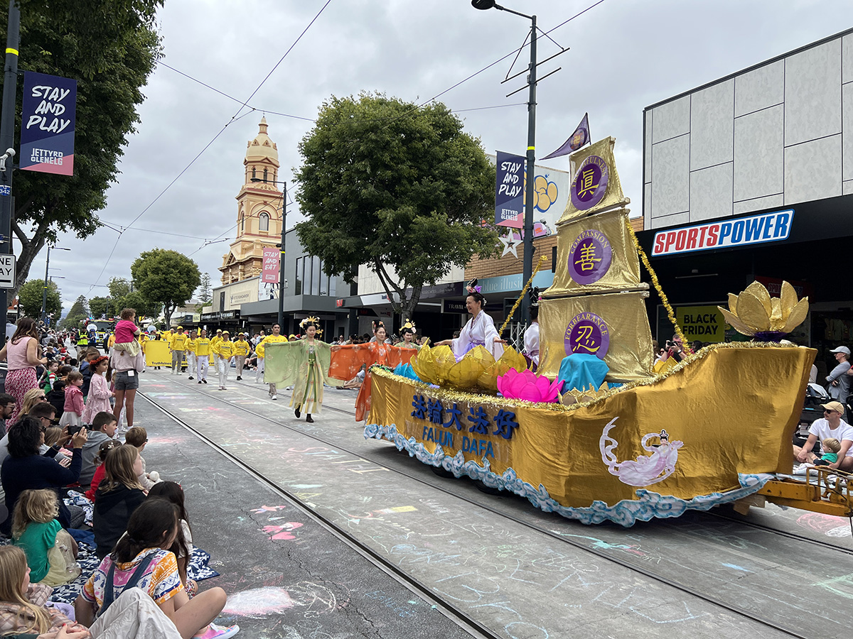 法轮功学员带来的金色花车传递真善忍的美好福音,身着仙女服装的学员在花车上展示着静功动作,唐装方阵的表演展现古典与传统,身着金黄色印有“法轮大法好”字样T恤的学员们面带微笑向观众展示舒缓的功法动作。