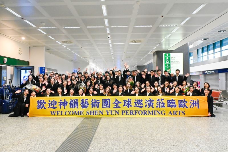 '图9:二零二三年十二月二十五日,圣诞日,神韵环球艺术团飞抵意大利米兰,在机场受到了粉丝们的热情迎接。(大纪元)'