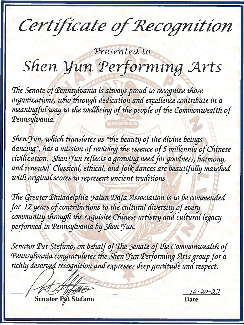 神韵将于二零二四年一月底及三月上旬在宾州演出,近期宾州第三十二区州参议员帕特·斯特法诺(Pat Stefano)代表宾州参议院发来褒奖状。祝贺神韵艺术团获得当之无愧的表彰,并表示深深的感谢和敬意。