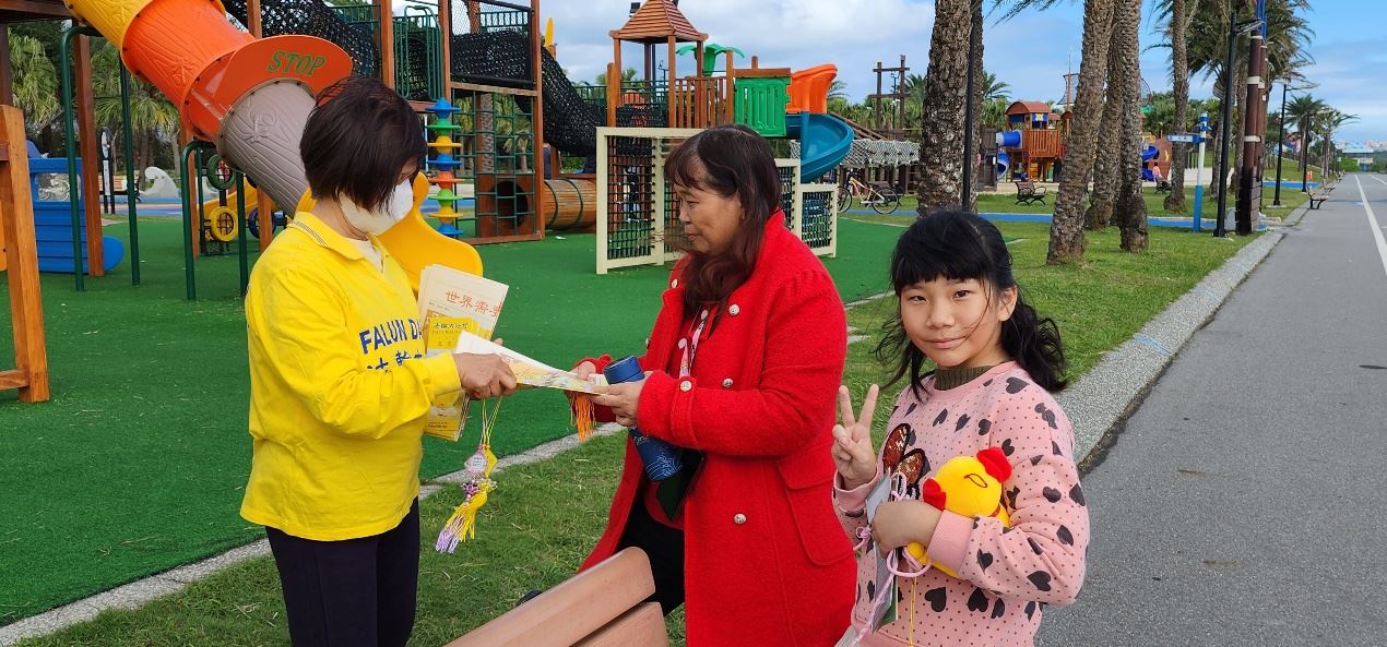 冬日的曦阳展颜,清澈而和煦,悠扬的炼功音乐在一望无际的太平洋不绝于耳,花莲大法弟子排列整齐,展示五套功法的祥和美好;部分学员手拿《法轮大法好》、《世界需要真善忍》特刊,向民众讲真相并送上一份份的新年祝福及关怀。