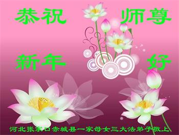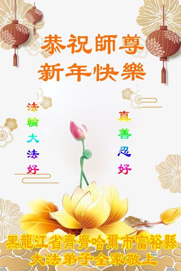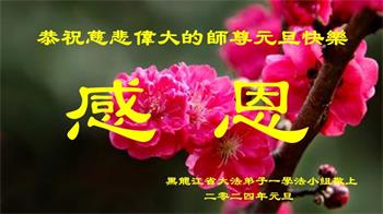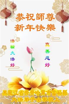 黑龙江省公安系统大法弟子在贺词中表示:“二十五年修炼的风风雨雨,弟子们都坚持下来了。请师父放心,在新的一年,弟子们一定会做的更好,勇猛精進,助师正法。”