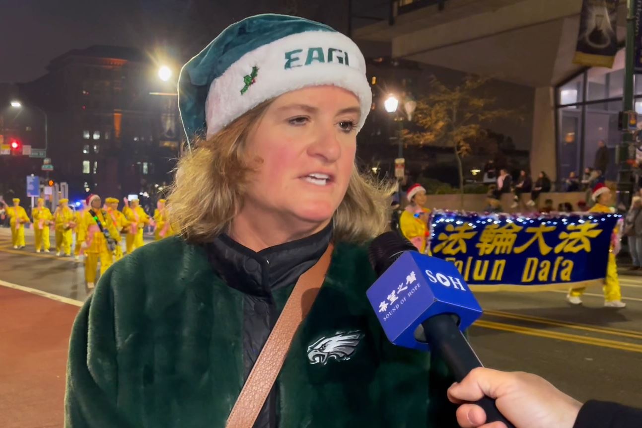 当看到法轮功学员的游行队伍时,克里斯蒂娜(Cristina)一直为他们鼓掌喝彩。克里斯蒂娜说,这是她第二次见到法轮功学员,不久前她在马里兰州银泉市的感恩节游行中第一次看到法轮功。她说:“每一次观看他们的游行队伍,我都很喜欢,他们如此平和,太棒了!”
