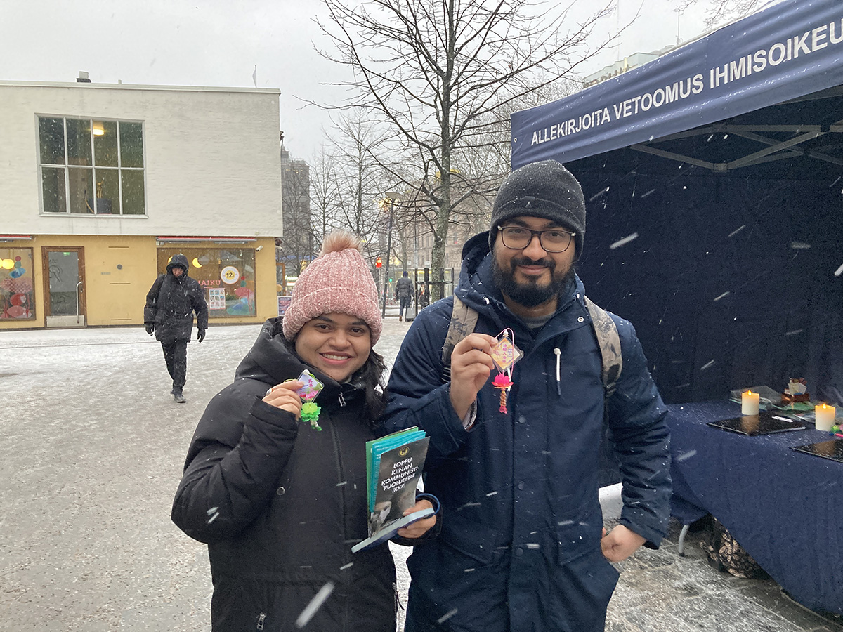 居住在法国的工程师高斯夫(Goseph)偕同台湾的太太来芬兰旅游。他太太正在跟他解释法轮功的情况。活动期间下起了大雪,只见高斯夫弯下腰,轻轻擦掉遗像上的雪,仔细阅读起来。那位台湾的太太走时向学员合十说:“法轮功真的很棒!”