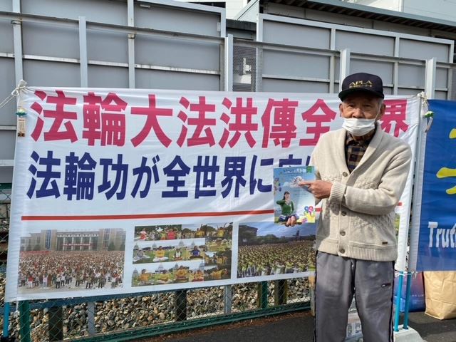 今年七十多岁的村松先生(Mr.Muramatsu)走到法轮功学员跟前说,他以前从认识的法轮功学员那里听到过很多关于法轮功被迫害的事情。有关法轮功的最新的真相杂志,他还没看过,里面的图片和介绍内容很详细,他觉得挺好,表示要带回家去看。临走时,他向法轮功学员表示感谢。