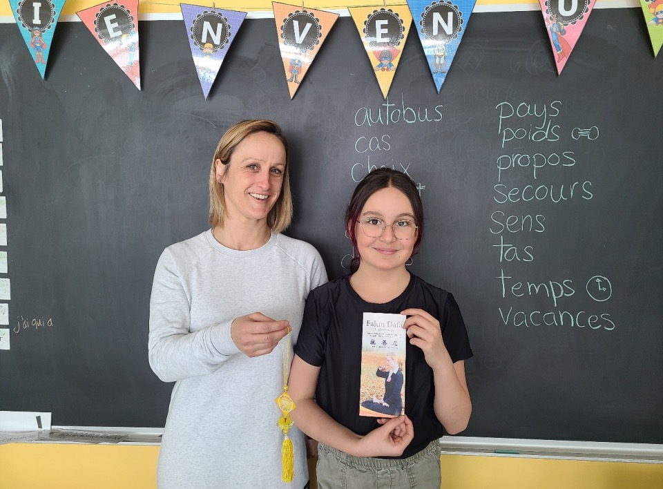 ![]() 图3:老师阿娜(Anne,左)和四年级学生马勒(Maëlle,右)在学校一起学炼了法轮大法。 |