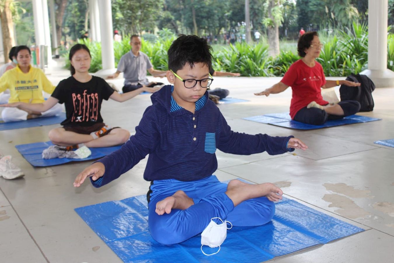 九岁的基郎(Gilang)今年就读国小三年级,是一名法轮功小弟子。他说,有时候因为课业忙碌,不能每天炼功学法,即便是父母时时提醒他炼功的重要性,但很不容易做到,“但是今天早上,我能够早上五点钟起床,感到很高兴能够和大家一起炼功。”他说。