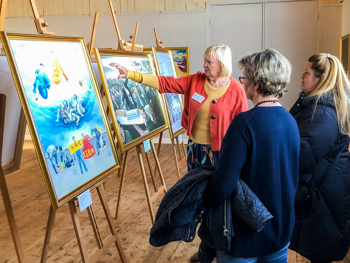 图2:克莉思汀娜(左一)在瑞典举办真善忍画展期间为观众做讲解,帮助人们了解大法真相。