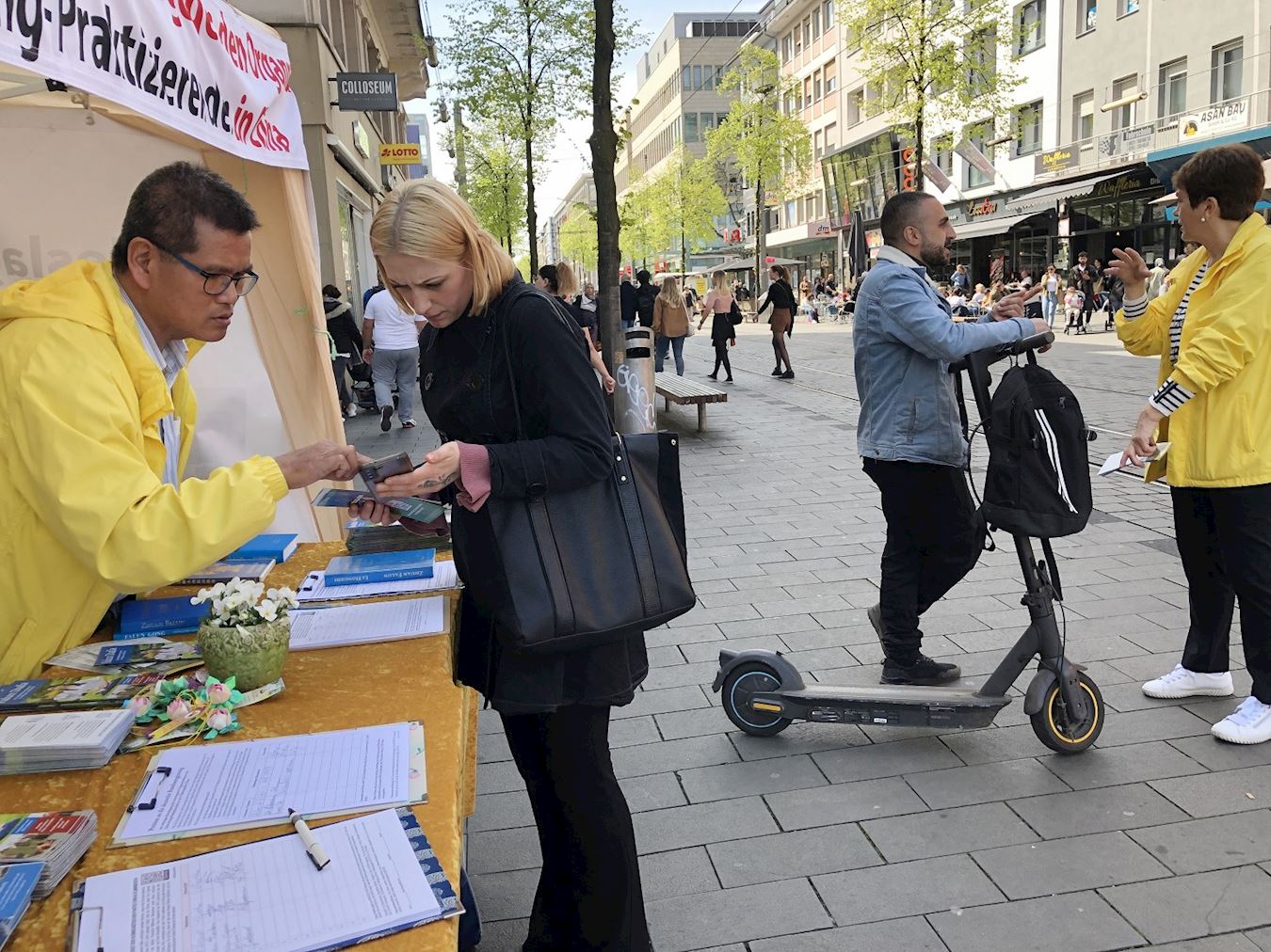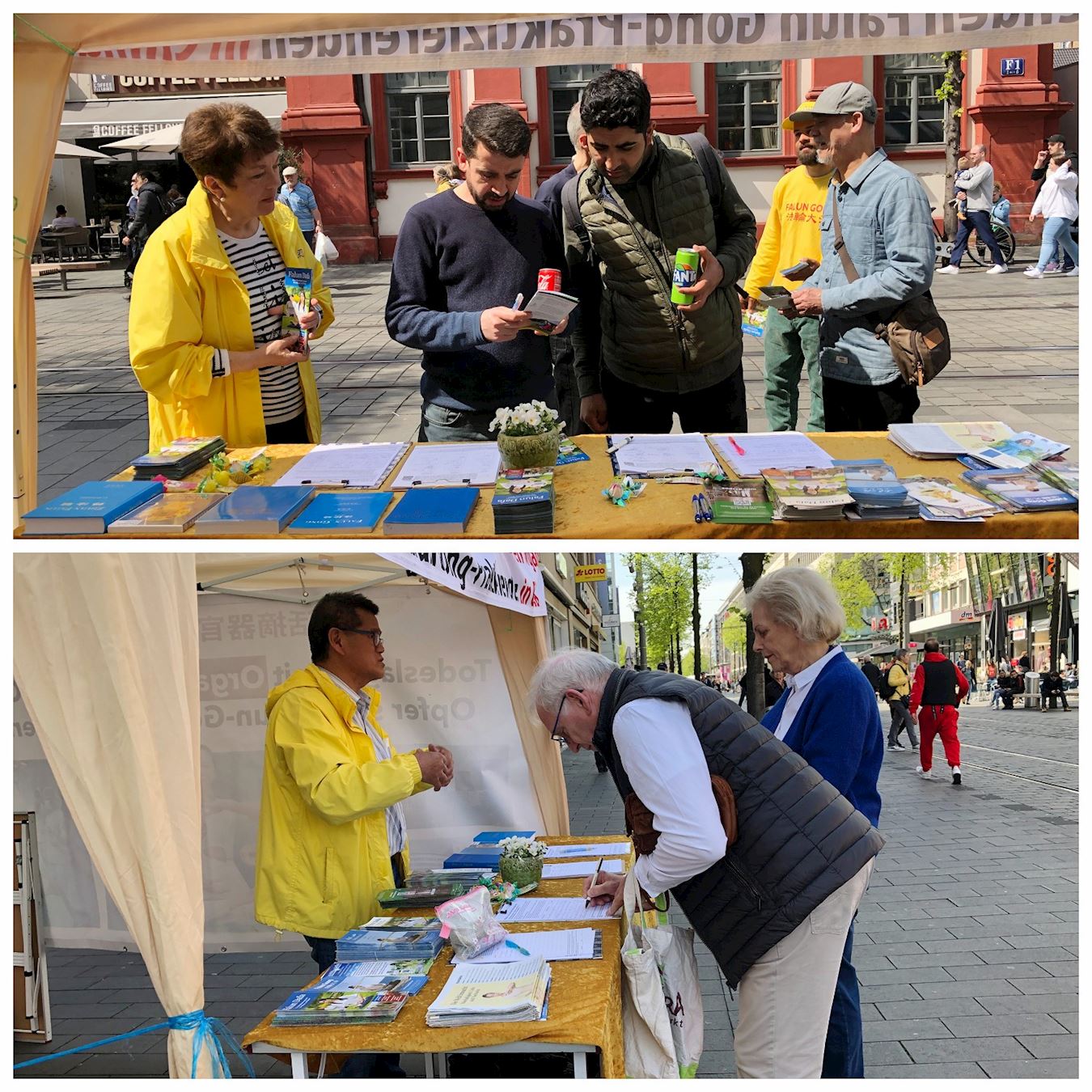 当日下午,天空阴雨绵绵。过往民众看到学员们无畏风雨、坚持传真相,深感敬佩,许多人拿出手机拍照,主动前来与学员交谈,并在了解真相后签名支持法轮功学员反迫害。也有人询问炼功点信息或留下联系方式,当场决定学炼法轮功。