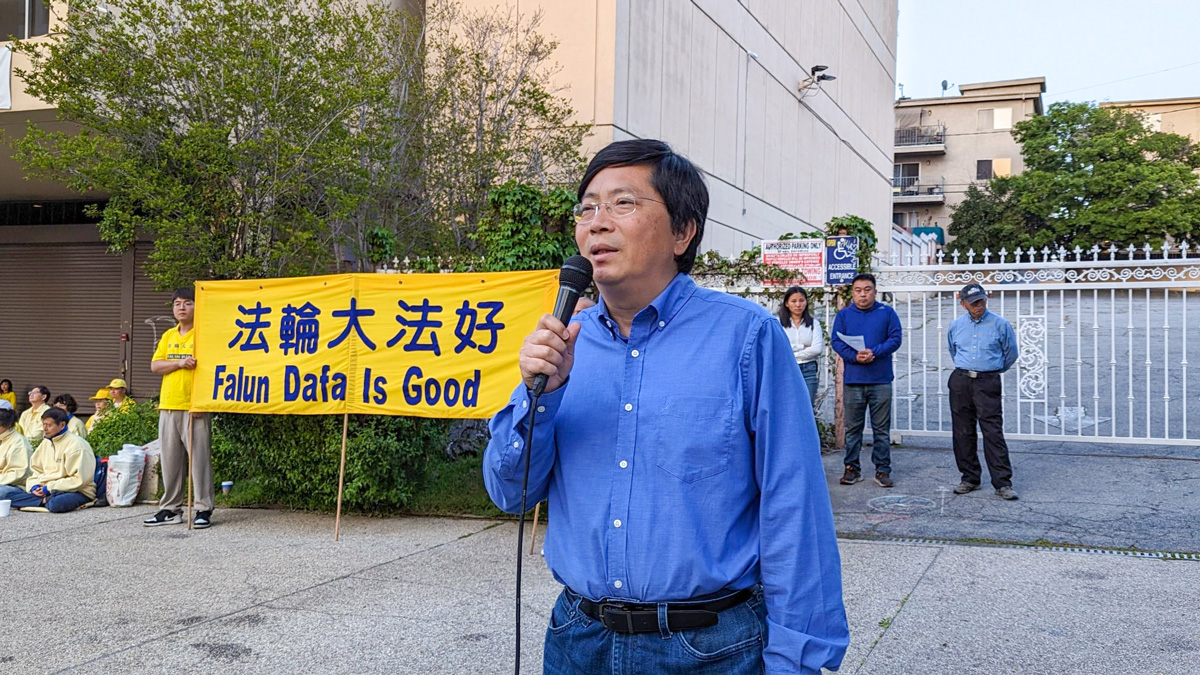 洛杉矶法轮大法修炼团体发言人、加州大学洛杉矶分校教授吴英年说:“我们每年来到这里纪念四·二五和平上访。法轮功一直秉承和平理性的方式,从来没有任何过激或仇恨的言论和行为,更是绝对没有任何暴力行为。”