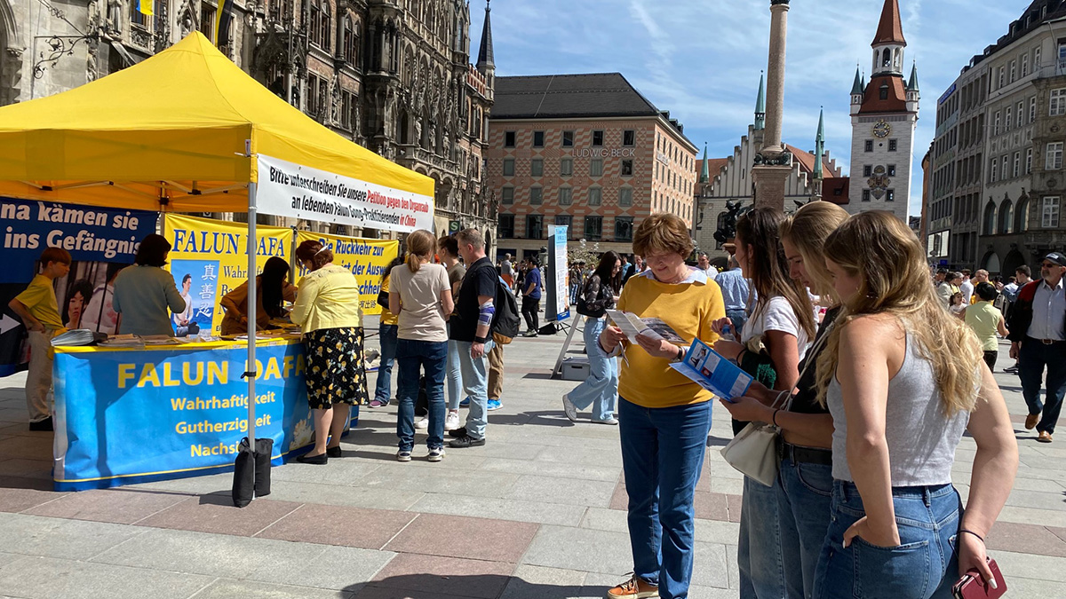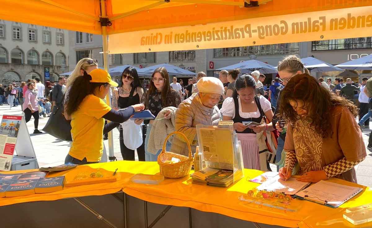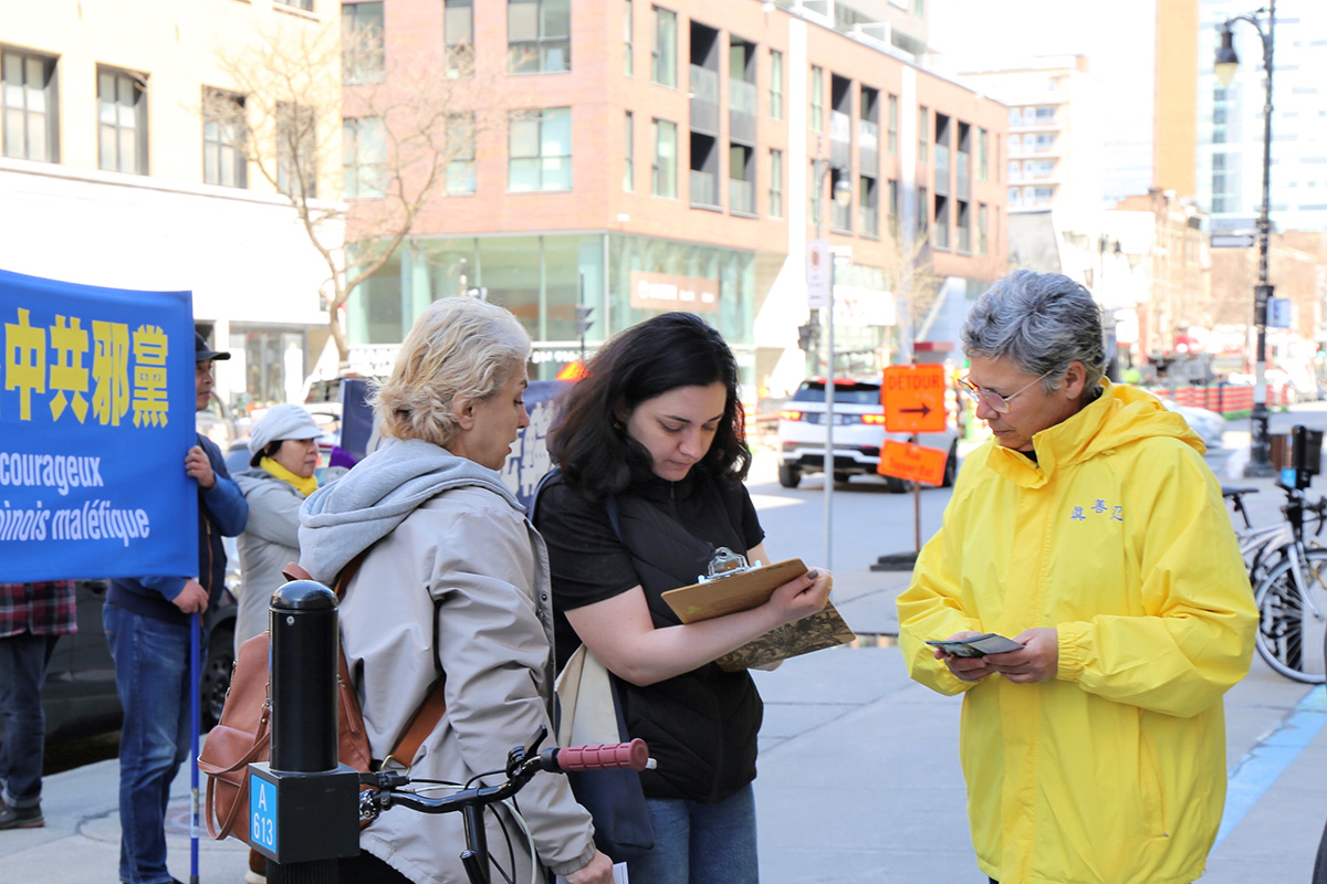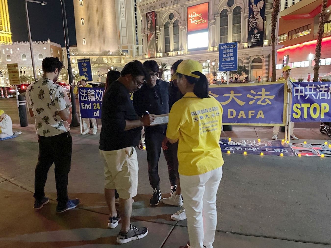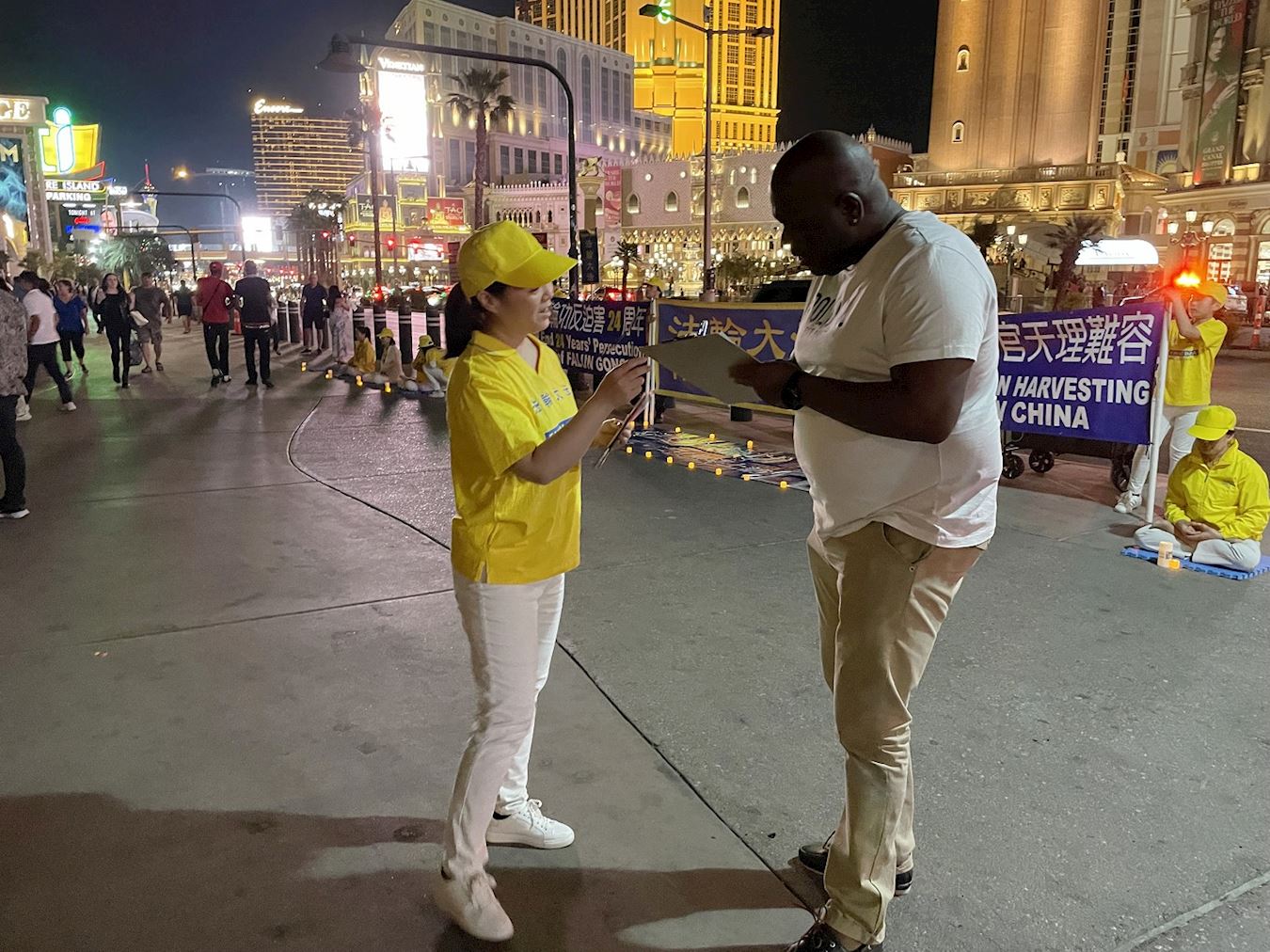 这些中国人都静静地听着,一位先生说:“我们来自美国,早就明白法轮功是被迫害的。就因为共产党不好,所以我们移民出来,远离那里。你们坚守信念,有良知,不屈不挠抗争这么多年,我们很佩服。我们知道你们争取的自由和人权,也有每个中国人一份,所以我支持你们也谢谢你们。”