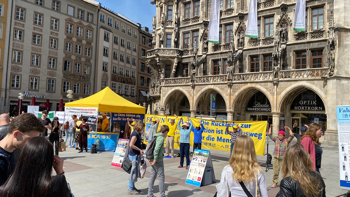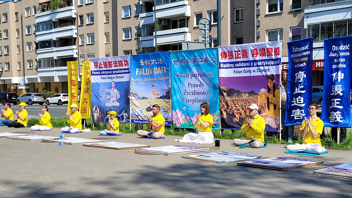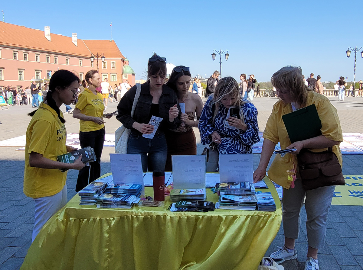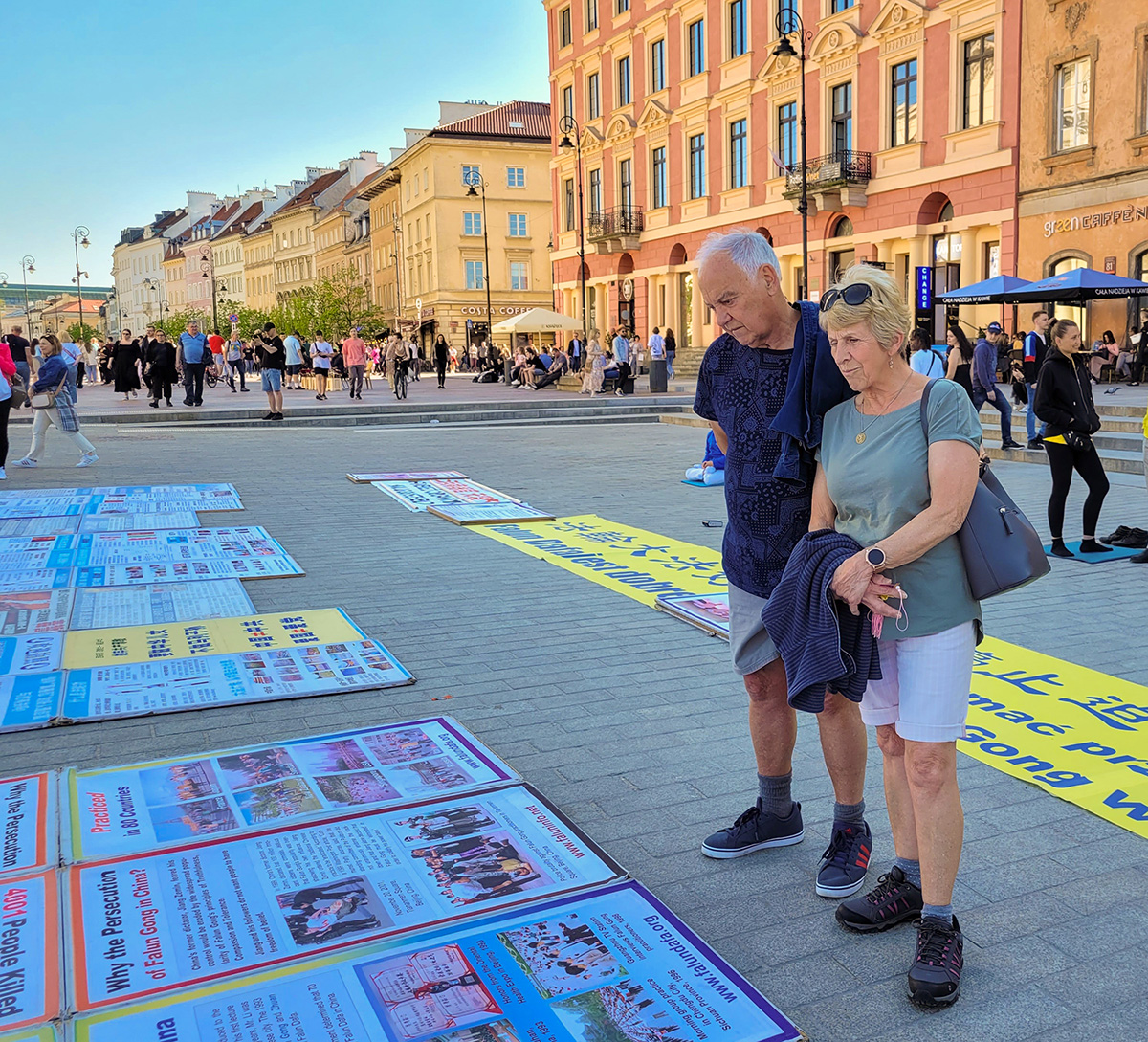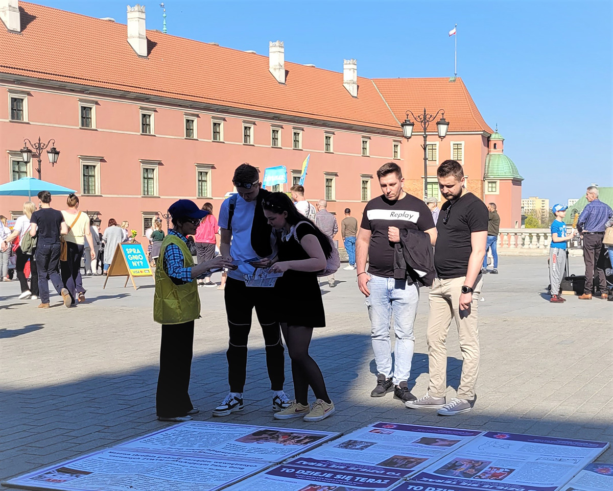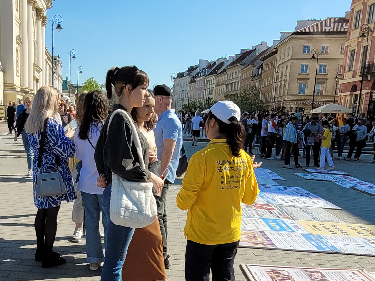 在华沙市中心繁华的古城中,法轮功学员大面积地摆放真相展板,立即吸引了众多游人观看。天气晴朗,游人如织,一队中国人站在展板前阅读内容,观看功法展示。学员给他们讲述二十四年前法轮功学员以和平方式,为争取自由修炼的环境上访后,却被中共抹黑成围攻中南海,加以残酷的迫害,甚至活摘器官至今。