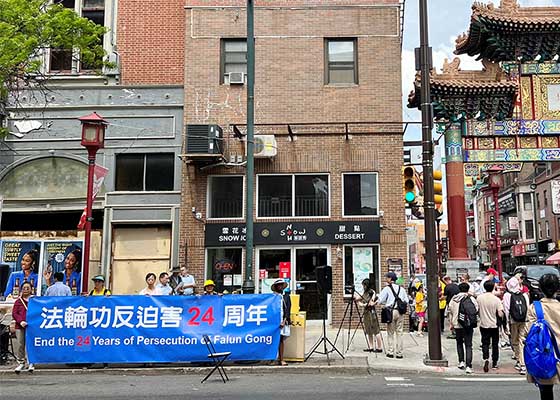 四月二十二日,大费城地区部分法轮功学员在华埠牌楼下举办集会,纪念“四·二五”法轮功和平上访二十四周年。