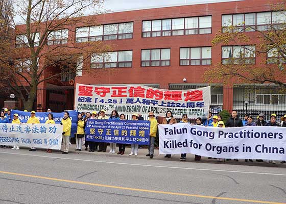 4月25日傍晚,加拿大温哥华部分法轮功学员在中领馆前举行集会与烛光活动,纪念四·二五和平上访24周年,并呼吁停止迫害法轮功。