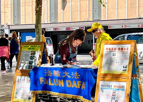 四月二十一日,澳大利亚南澳州法轮功学员在阿德莱德市中心举办“纪念四·二五”讲真相活动,吸引民众关注,并签名支持反迫害。
